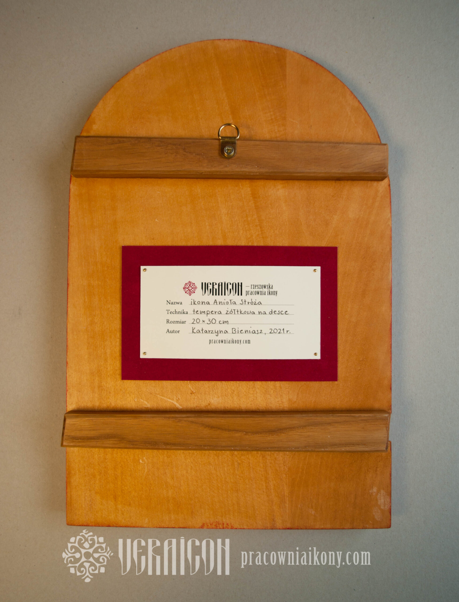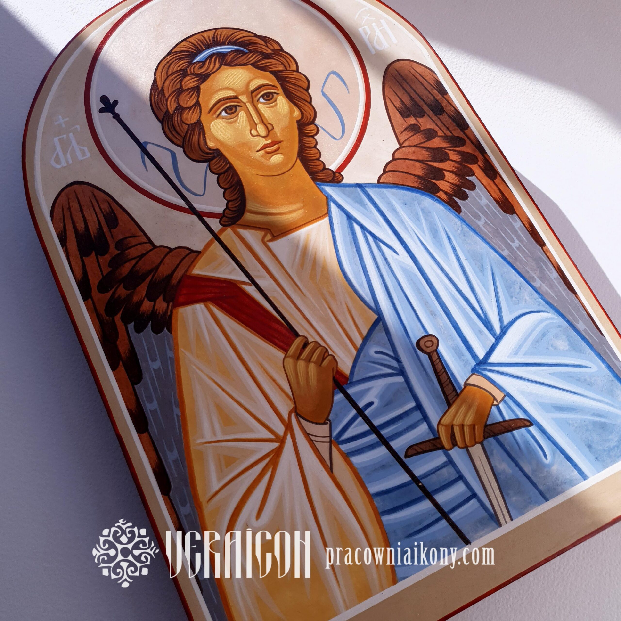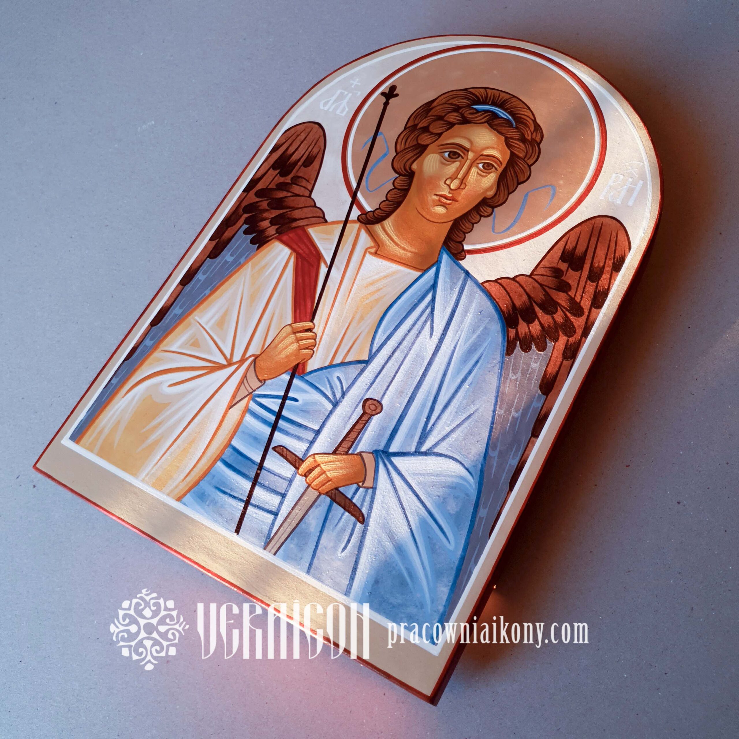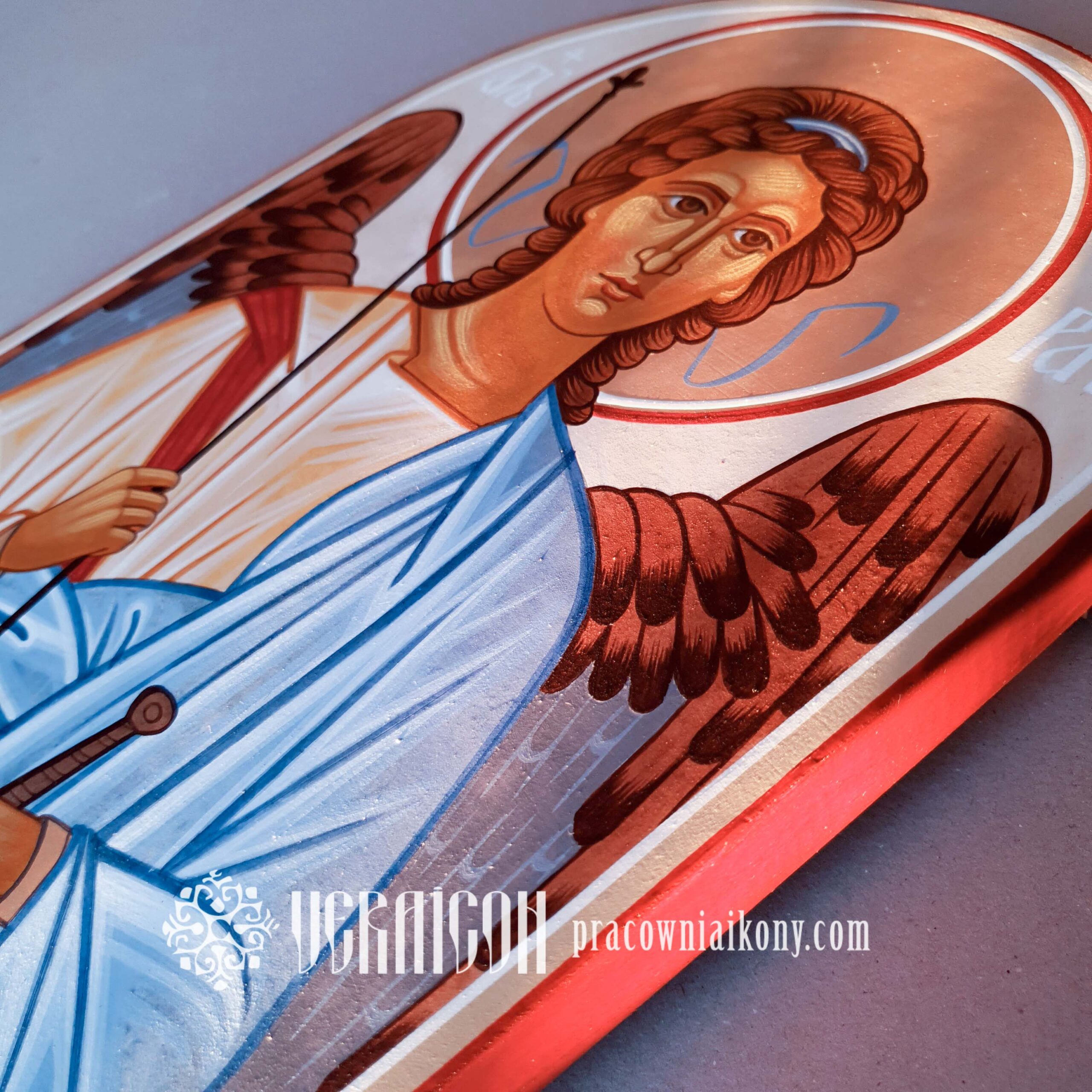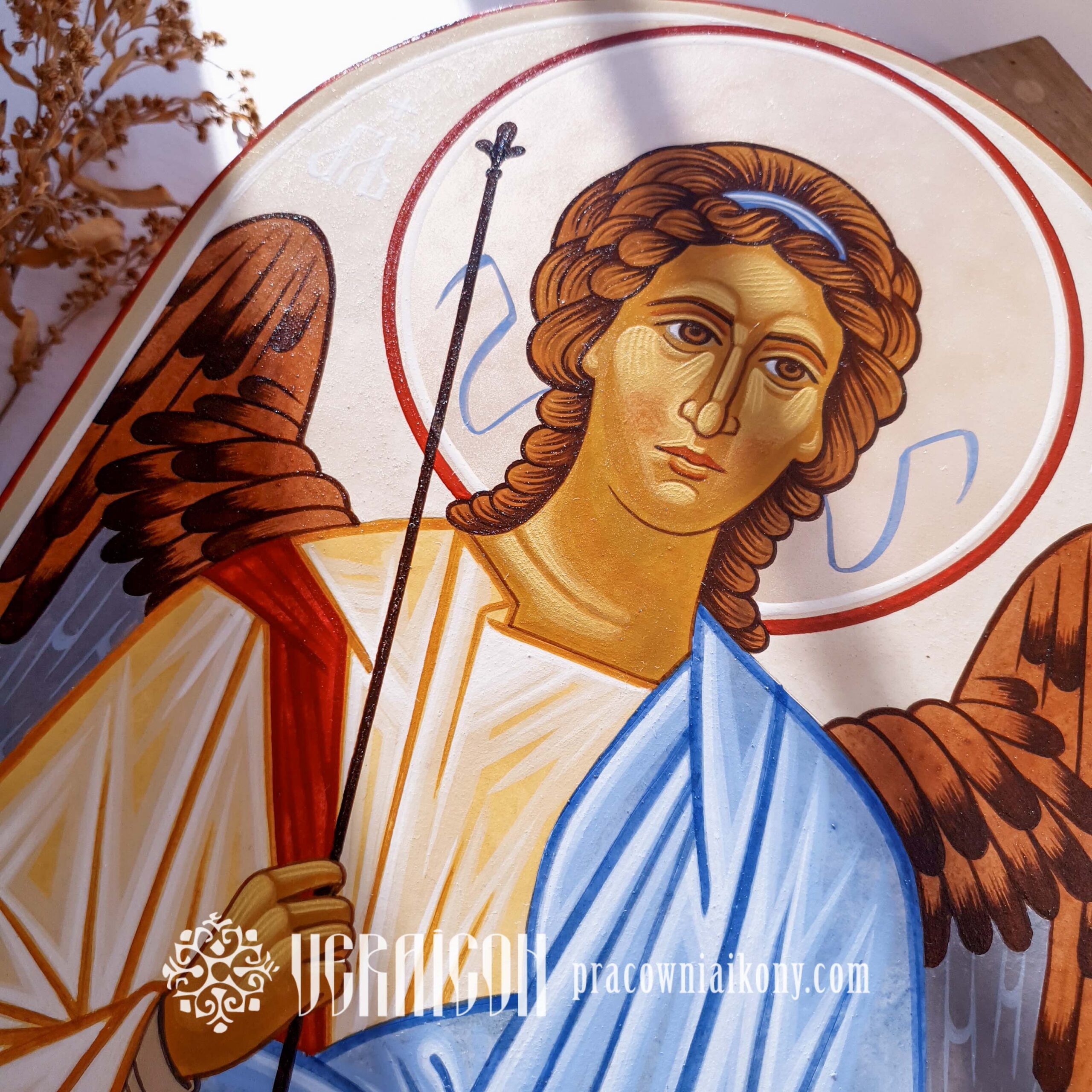 Ta ikona przedstawia anioła w ujęciu do ramion. Postać o delikatnych, młodzieńczych rysach pochyla okoloną upiętymi lokami głowę w geście troski. Na głowie nosi diadem, a wokół głowy falują wstążki – słuchy, które są symbolem posłuszeństwa Bogu.