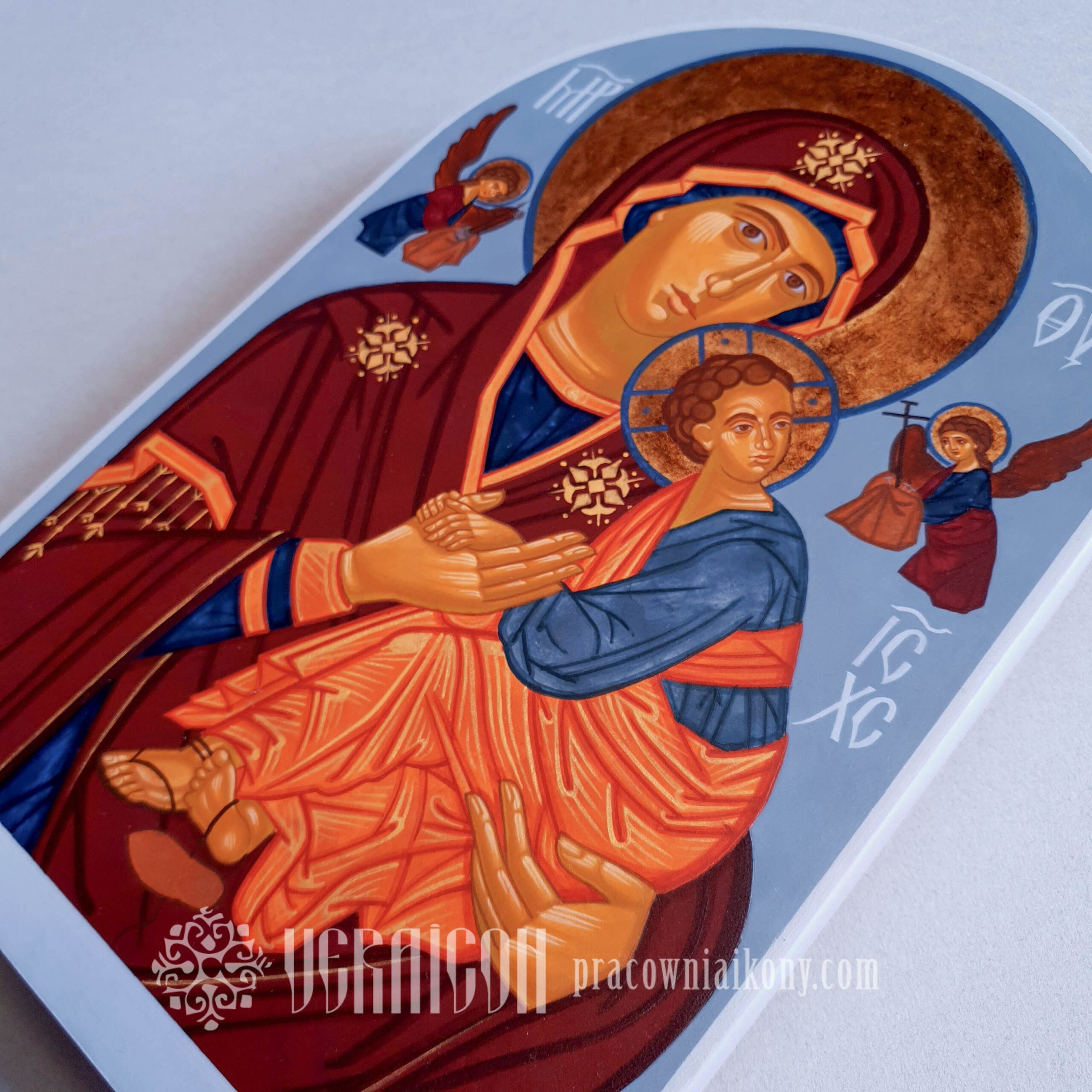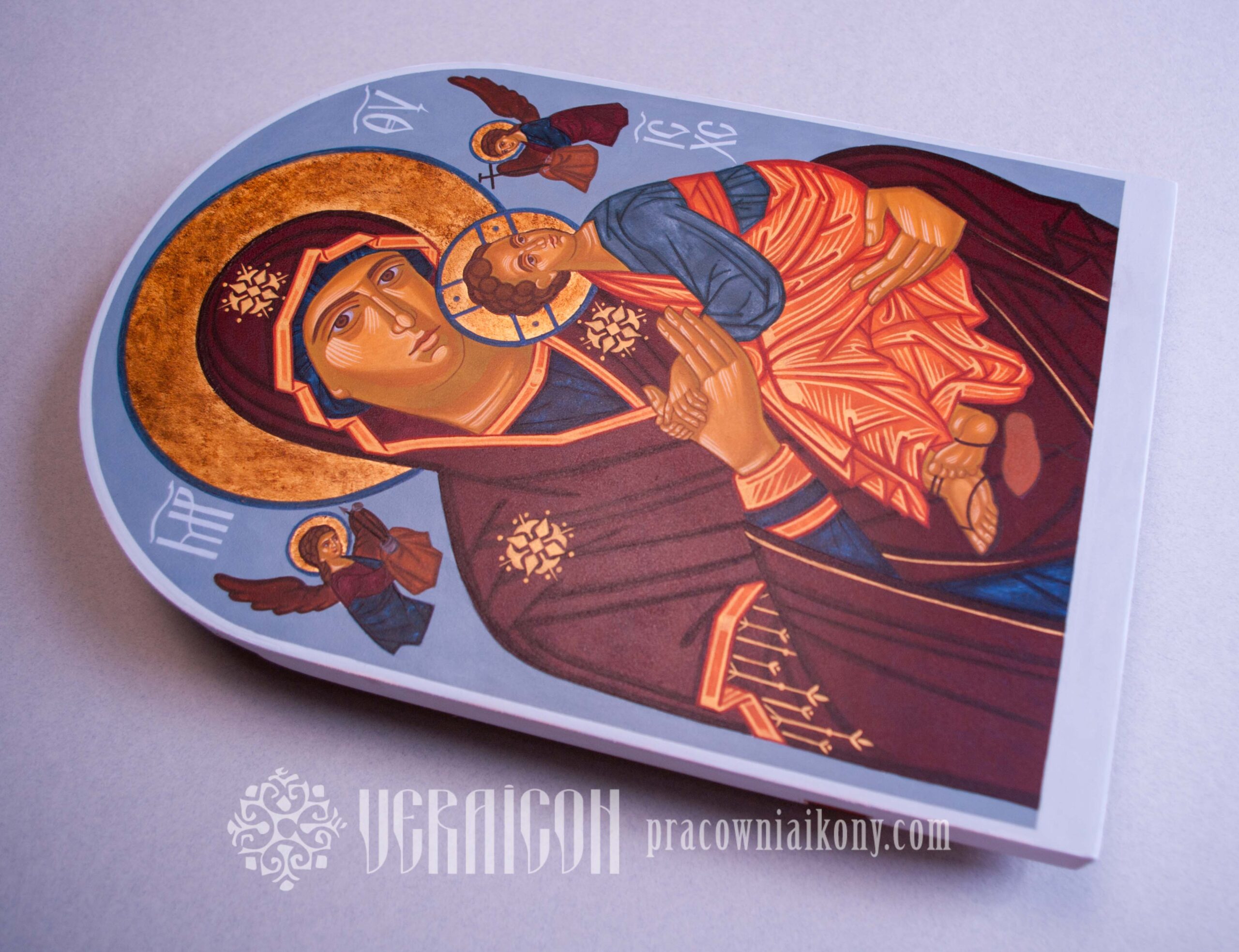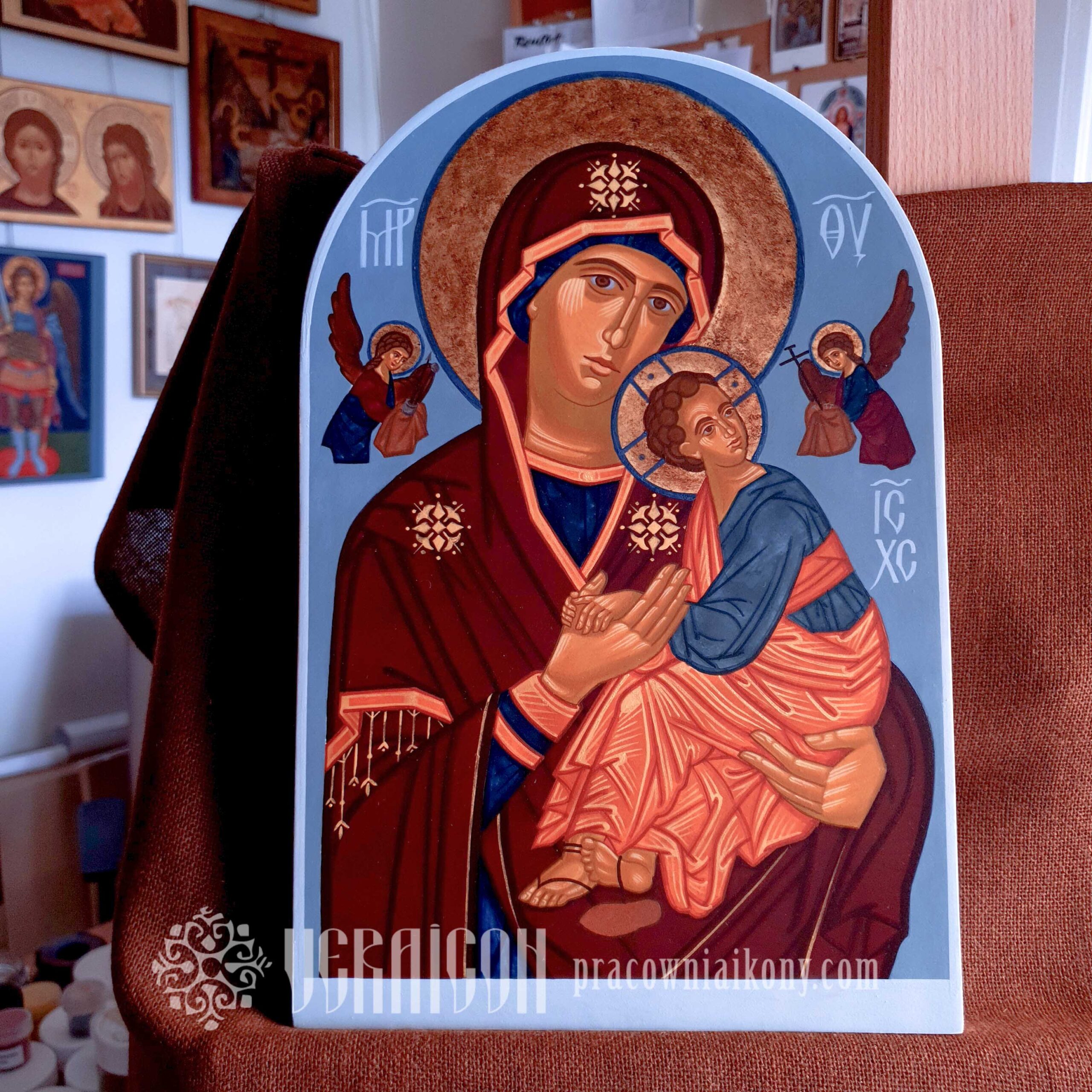 Ten motyw ikonograficzny określany jest jako Eleusa – “Czuła” lub Glykofilousa czyli “Słodkomiłująca”. Najsłynniejszym i zarazem jednym z najstarszych wzorów tego przedstawienia jest ikona z Włodzimierza, a właściwie z Wyszgorodu pochodząca z XII w. To szczególnie czczona na Wschodzie ikona. Ze względu na cuda, które dokonały się za jej pośrednictwem obchodzone jest święto ikony Matki Bożej Włodzimierskiej w dniu 23 czerwca. Charakterystyczną cechą tego motywu jest delikatny i pełny zaufania gest Dzieciątka, które przytula swoją twarz do policzka Matki i wyciąga do niej rękę obejmując za szyję. Praca inspirowana jest ikoną M. Sheshukova.