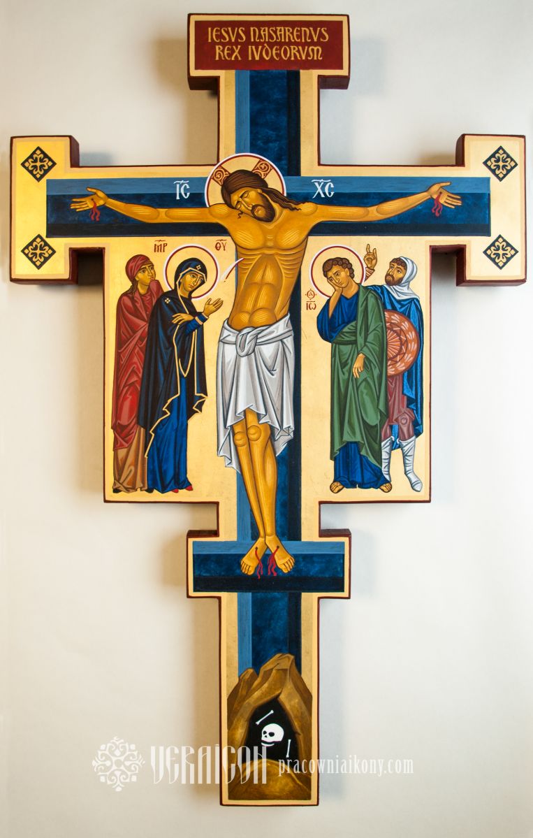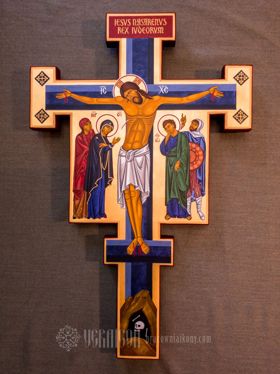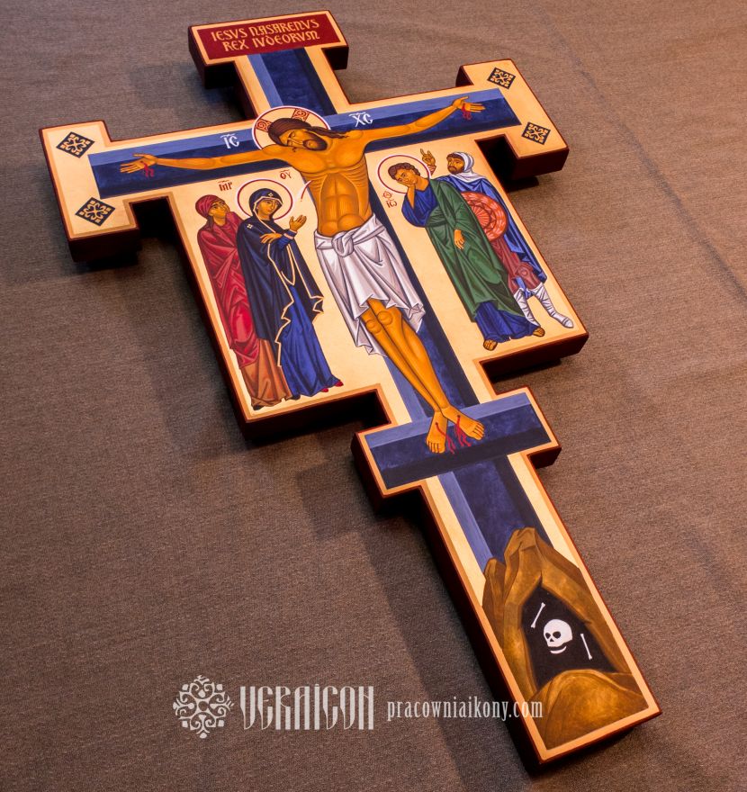 Ciemny błękit krzyża nawiązuje do tradycji malarstwa bizantyńskiego, w którym symbolizuje raj.