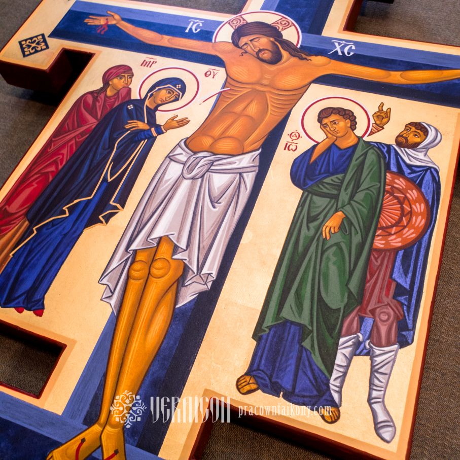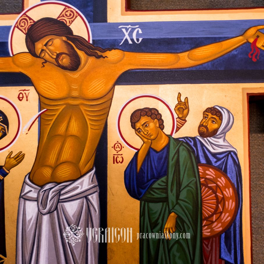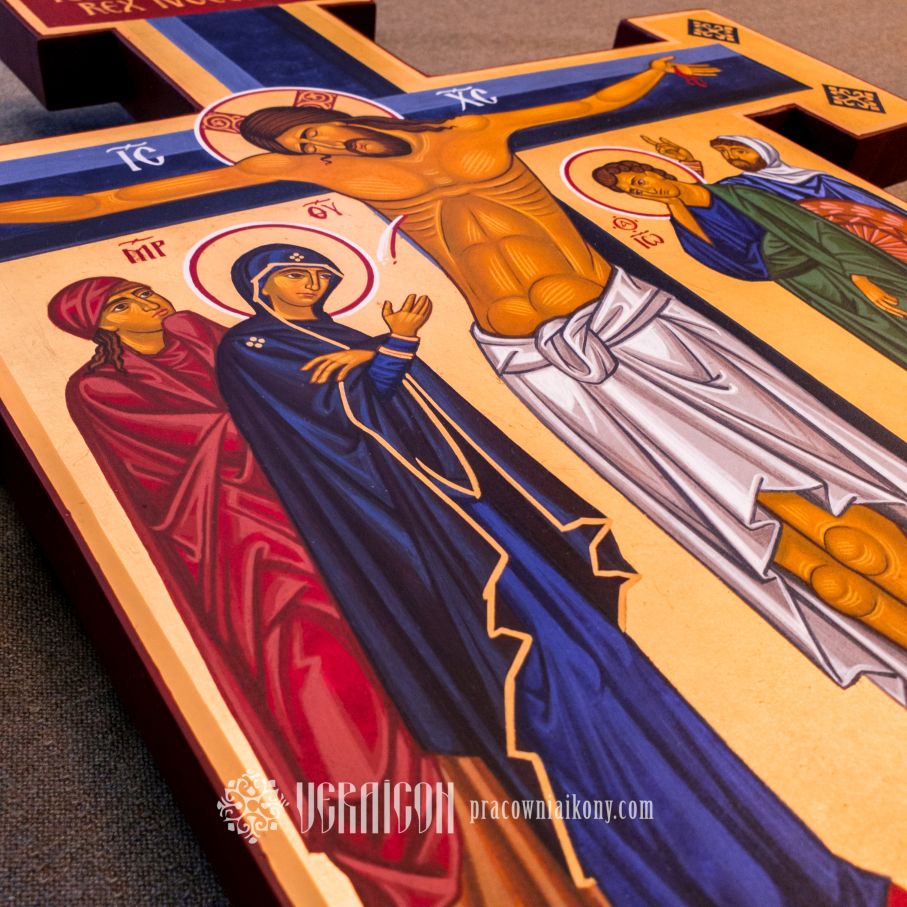 To nietypowa ikona, ponieważ umieszczone na niej postaci świętych nie znajdują się w kanonicznej scenie Ukrzyżowania. Zostały wskazane przez osobę zamawiającą z osobistych względów. Takie zmiany w dawnej sztuce miały miejsce często, na ikonach różnego typu umieszczano postaci świętych patronów lub szczególnie czczonych świętych. Postaci widoczne u dołu od lewej to: św. Franciszek, św. Maciej Apostoł, św. Filip Diakon, św. Odo z Cluny. Pod krzyżem stoi Matka Boża i św. Patryk, a powyżej znajdują się figury Archaniołów: Michała i Gabriela.