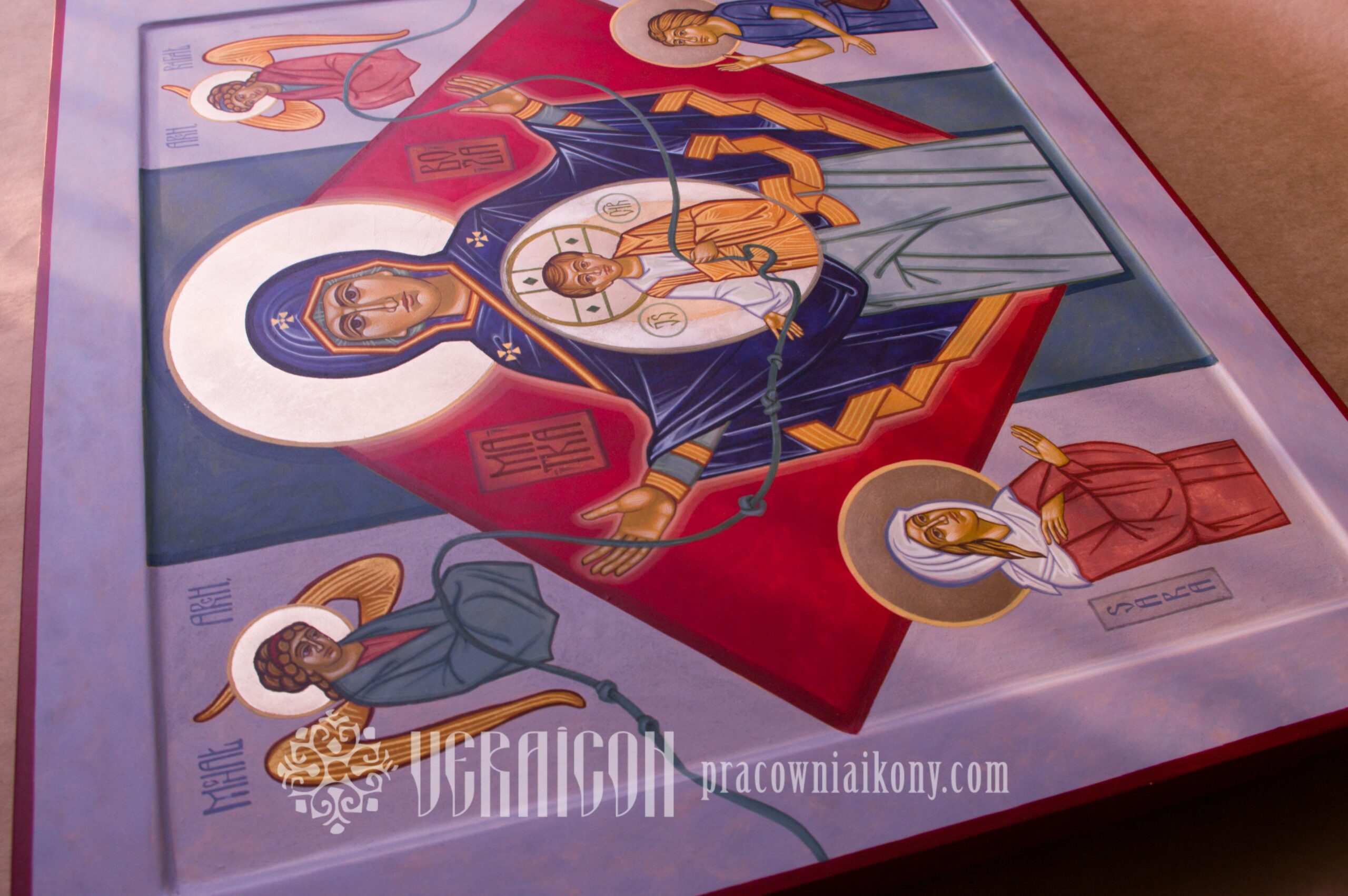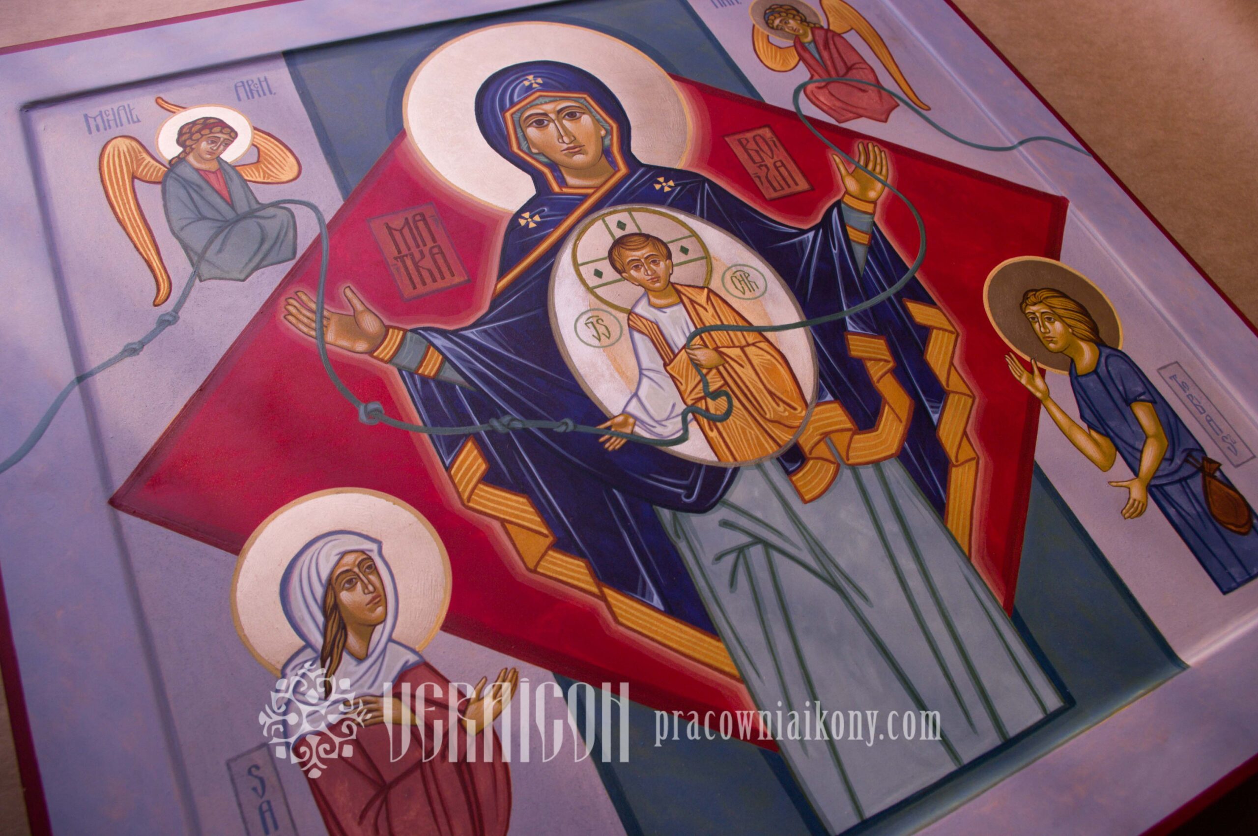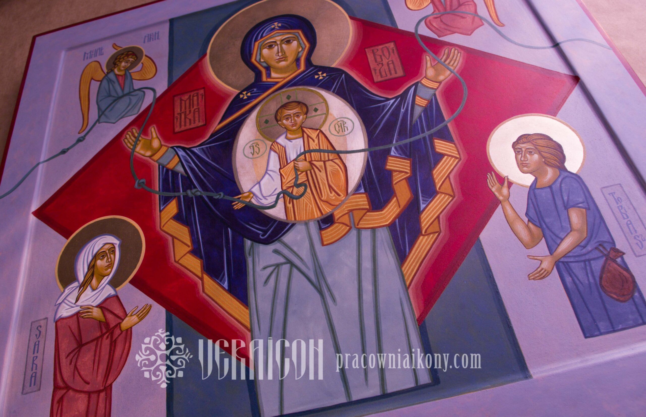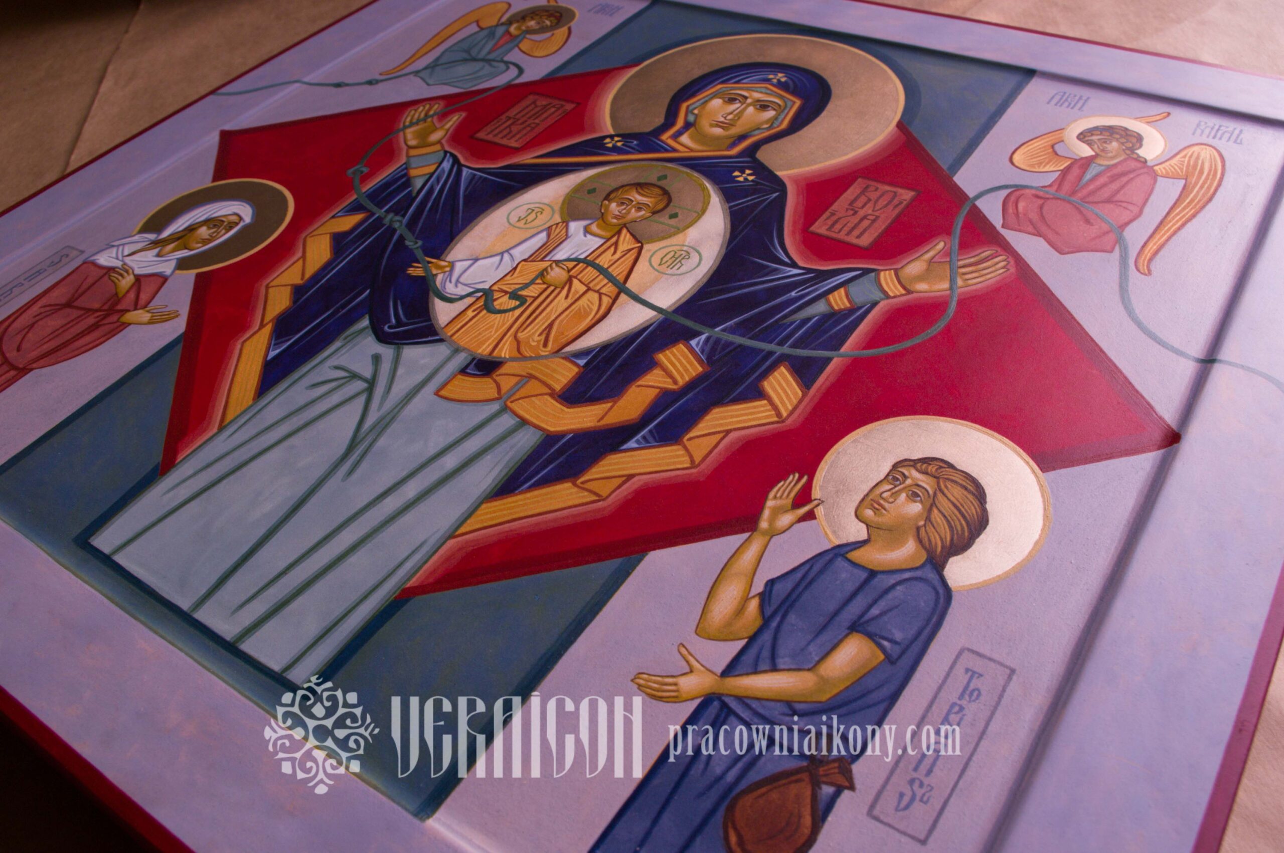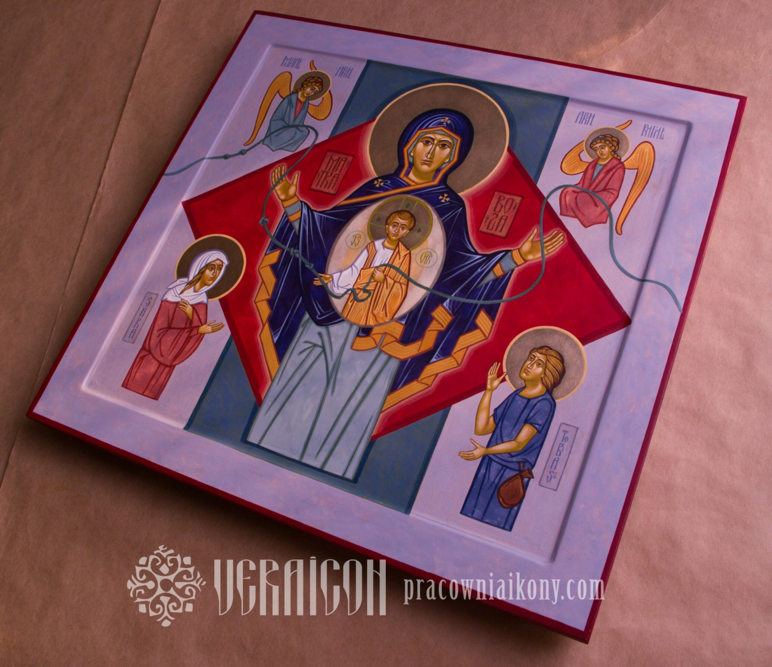 This icon was created on special commission in an expanded version. In addition to Mary, Christ, and the Archangels Michael and Raphael, the figures of Tobias and Sarah from the Old Testament were included. By referencing the story in the biblical Book of Tobit, the icon becomes a symbol of prayer for support in difficult family and marital relationships.