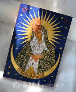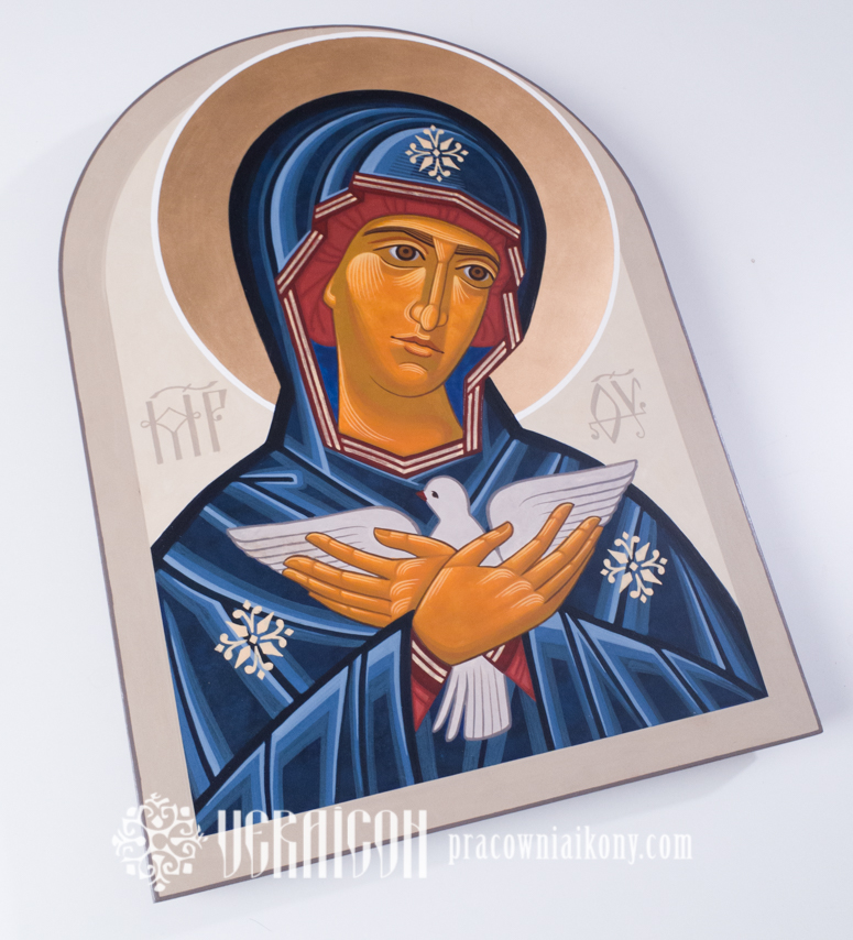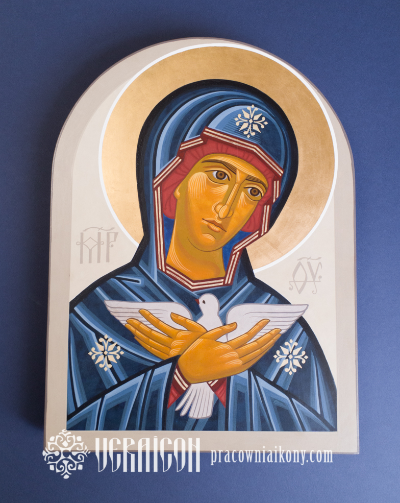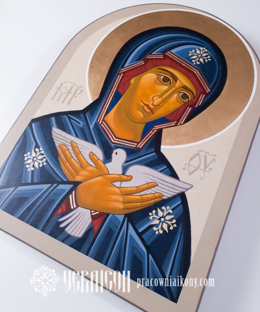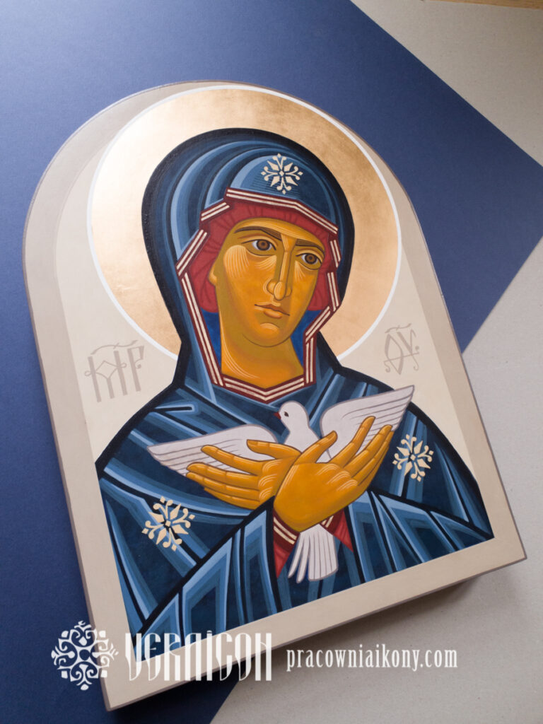 This original icon of the Mother of God Pneumatophora depicts Mary as the one who carries within her the mystery of the Holy Spirit’s action. The style of the icon combines a contemporary simplicity of composition with elements of traditional Byzantine aesthetics.