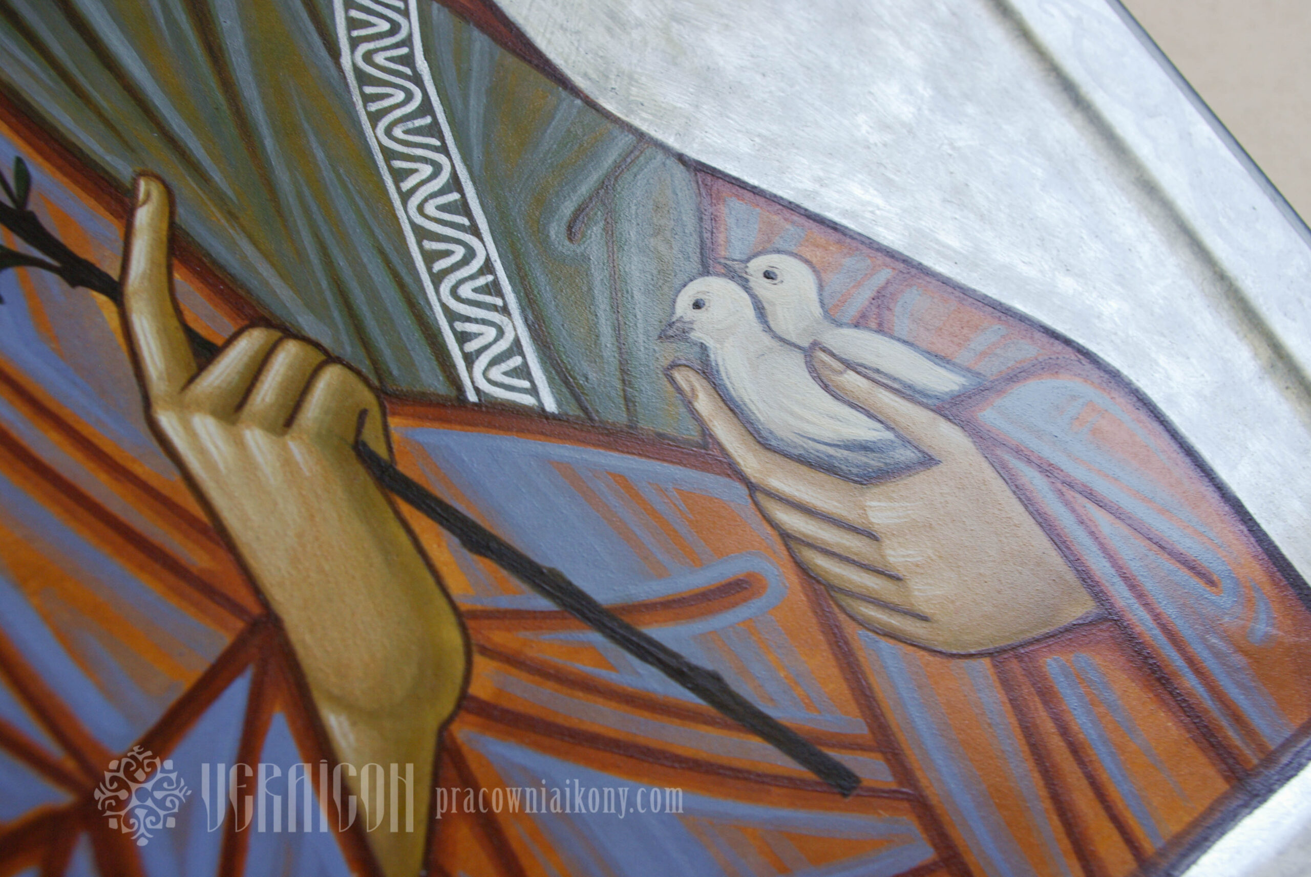 The icon depicts St. Joseph holding the Jesus Child on his arms. Emmanuel – the term used for Christ in his youthful representation – raises his right hand in a gesture of blessing. St. Joseph supports Him gently, resting the Child’s foot in his hand, a symbolic gesture of care, protection, and acceptance of the growing child’s path.