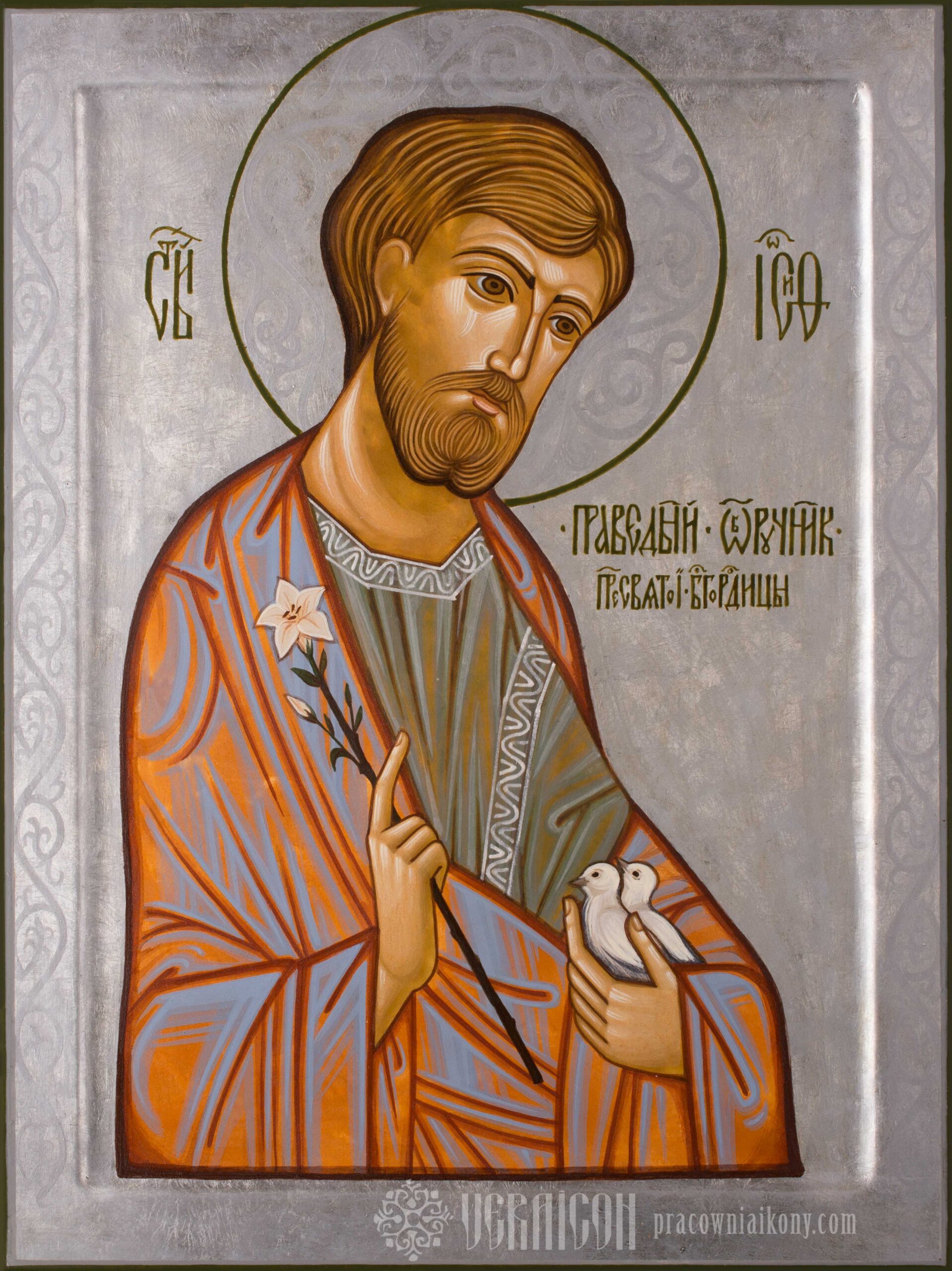 St. Joseph of Nazareth is venerated in the Eastern Church as the “Righteous” and the “Betrothed.” He is the patron of families, fathers, expectant mothers, as well as workers and the poor. He is most often depicted in icons of the Holy Family or with the Christ Child on his arm. In compositions focusing solely on St. Joseph, symbolic elements such as lilies, doves, or carpenter’s tools often appear.