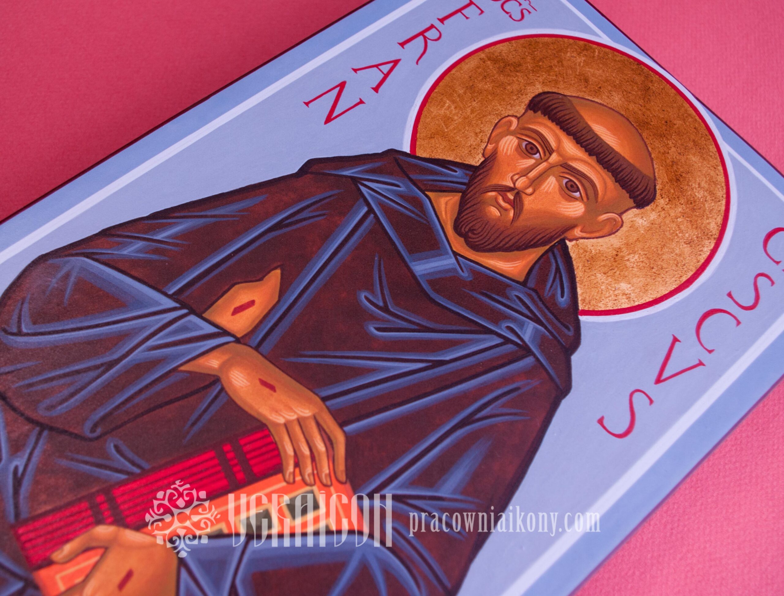 There are many depictions of the saint. The only historically reliable image is considered to be his portrait by Cimabue on the fresco in the Basilica of St. Francis. In creating this icon, I drew inspiration from several representations, adapting the motifs to best convey the essence of Franciscan spirituality.