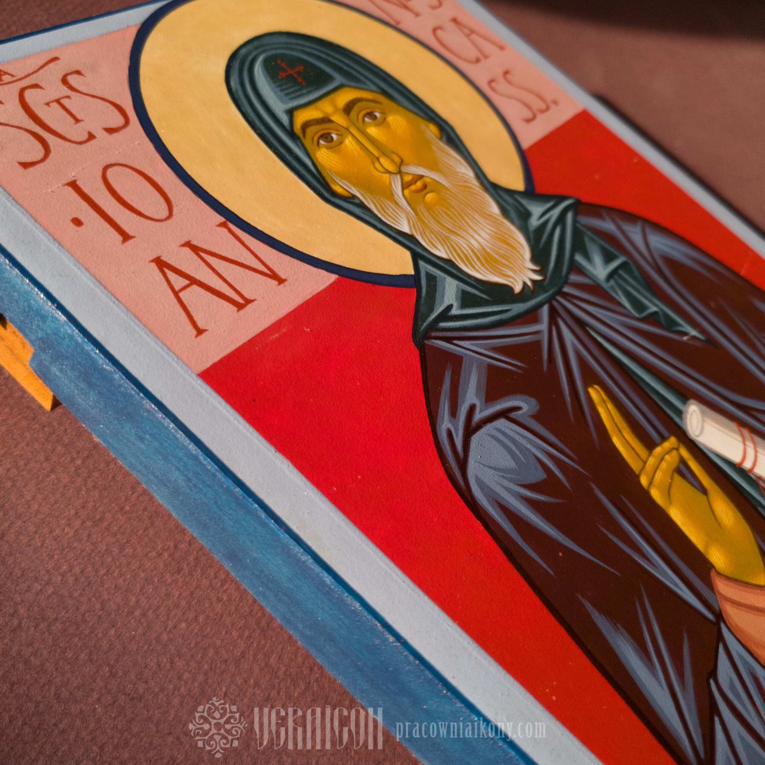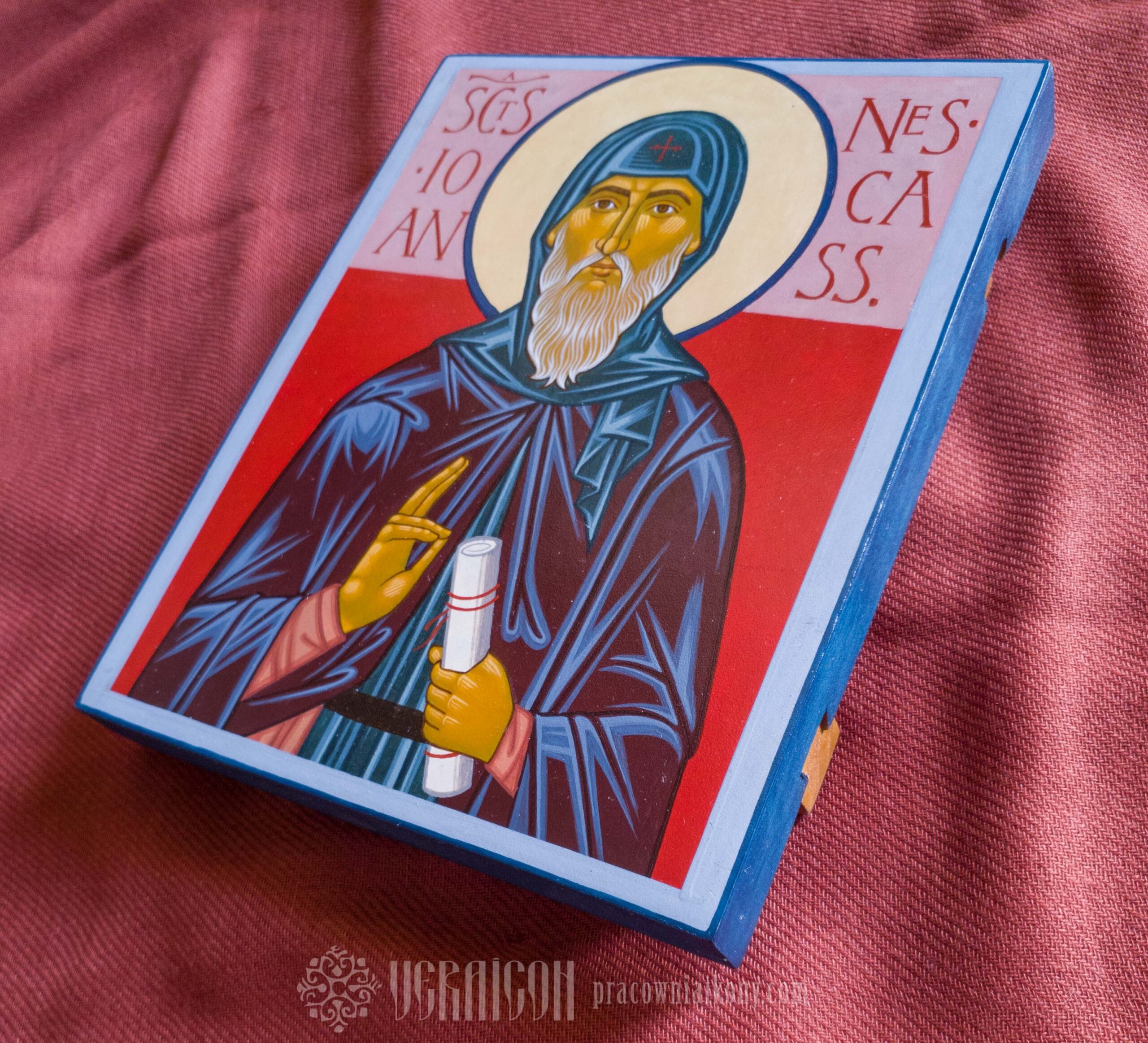 This small icon of St. John Cassian depicts the saint frontally, dressed in the dark habit of a monk. His face, with elongated features, a long grey beard, and a focused gaze, emphasizes his spiritual maturity and a life devoted to prayer and contemplation. In his hand he holds a scroll – a symbol of his teaching and writings on monastic life.
