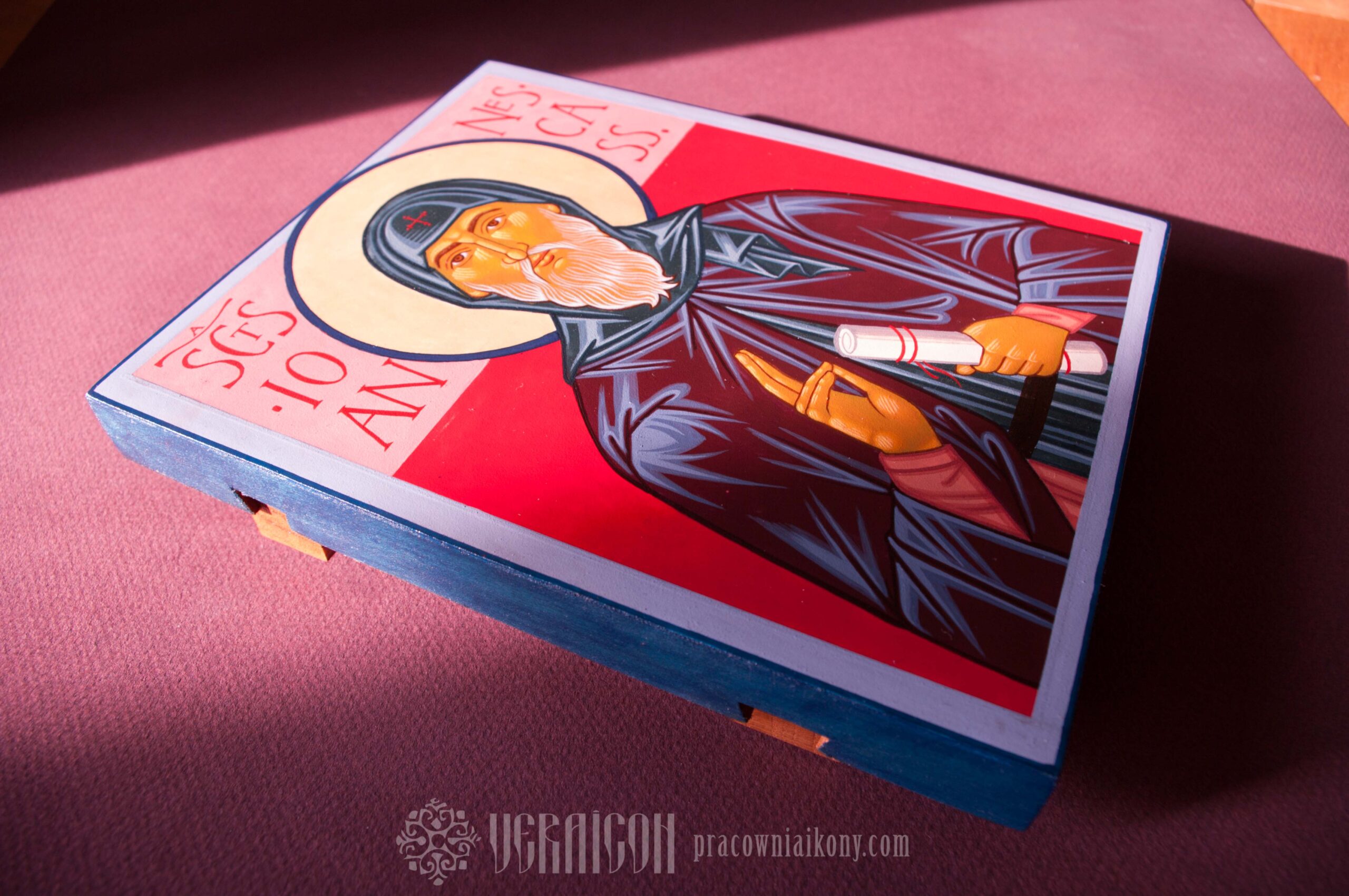 The strong, contrasting color palette – combinations of red, deep purple, and blue – gives the icon clarity and dynamism, highlighting the saint’s spiritual energy and authority. The small format preserves its devotional character, while the intense colors draw the viewer’s attention and enhance the expressiveness of the image.