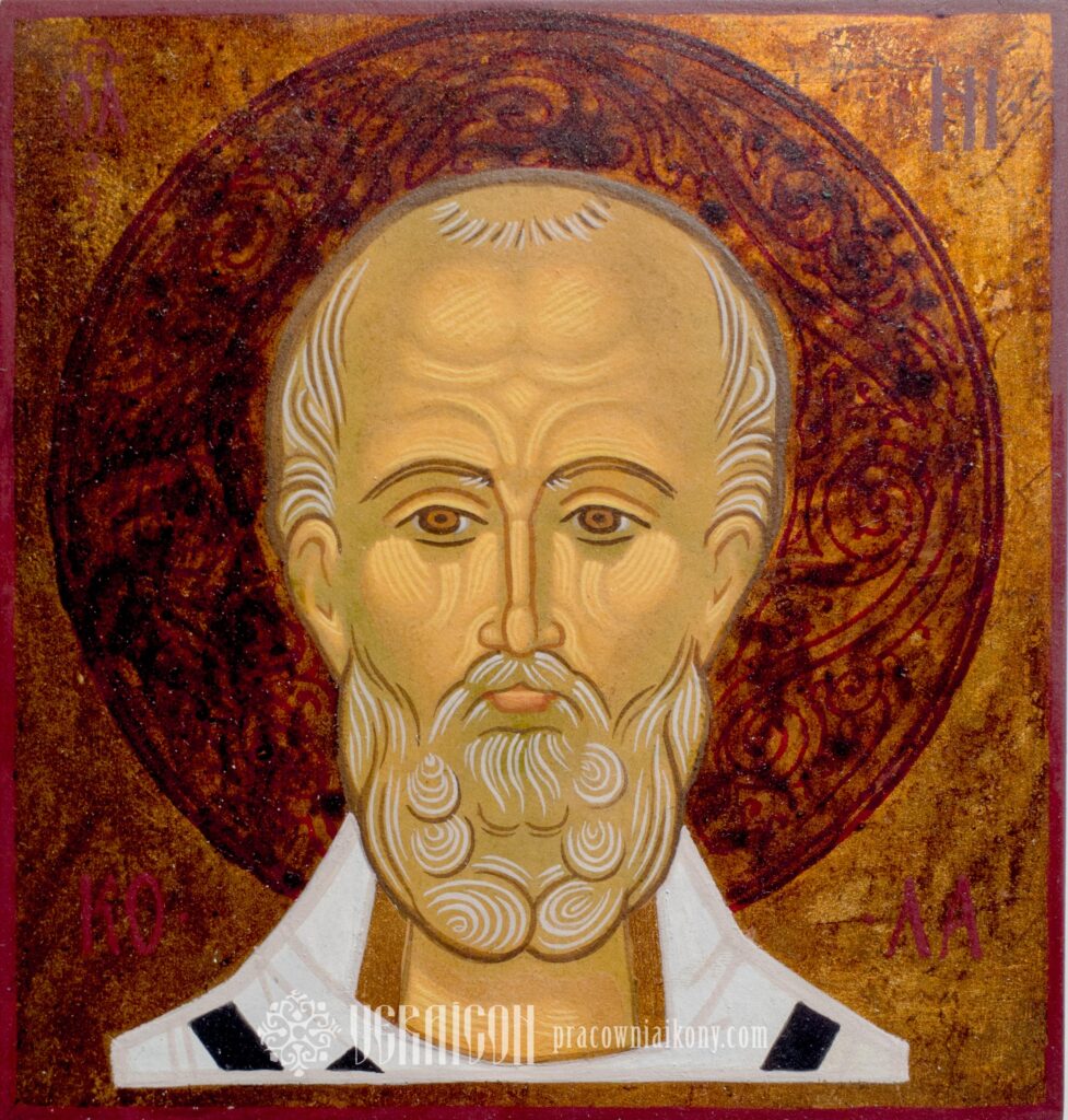 The inscription on both sides of the figure (Άγιος Νικόλαος) means “Saint Nicholas” in Greek. The characteristic white robe, decorated with a pattern of black equal-armed crosses, represents a bishop’s vestment from the Byzantine Empire. Over it is draped the omophorion – a wide band with crosses worn around the neck – which signified episcopal dignity and symbolized the story of the lost sheep that Christ took upon His shoulders and carried to the Father’s house.