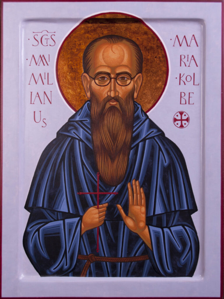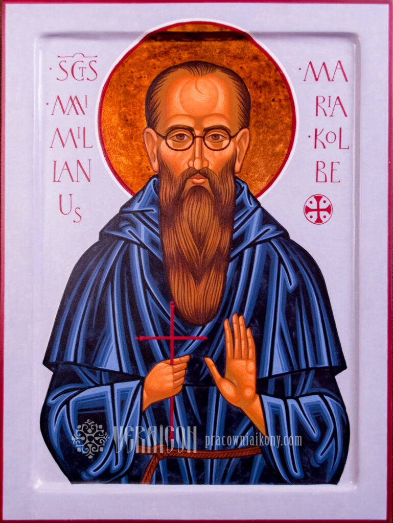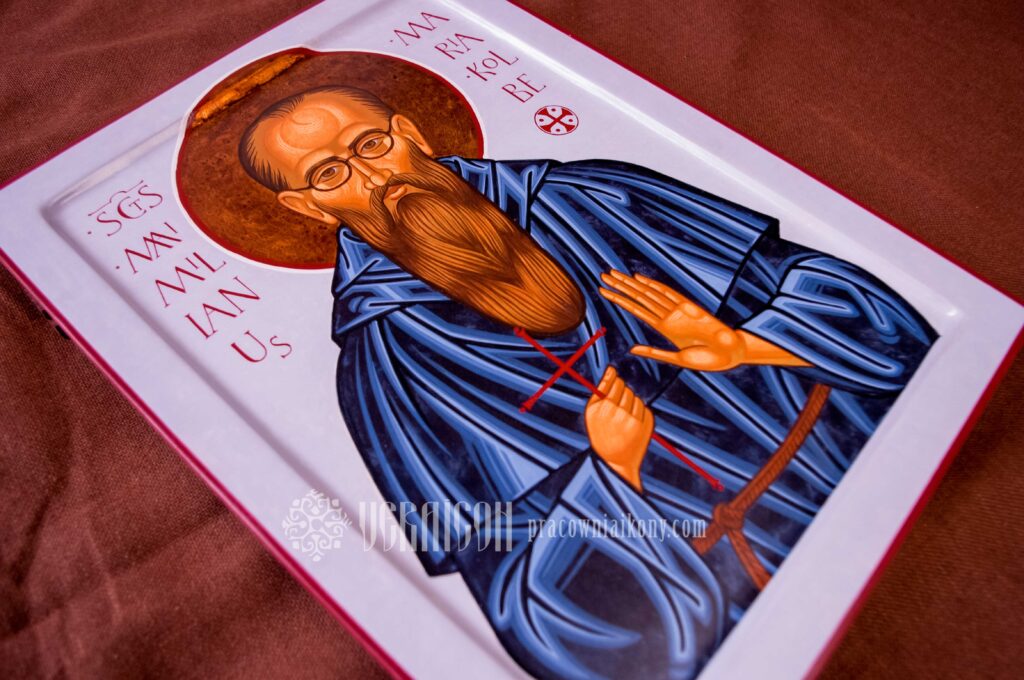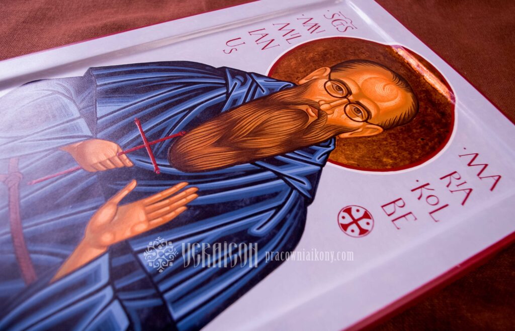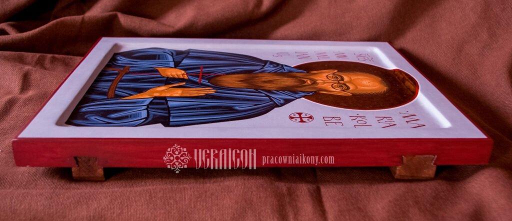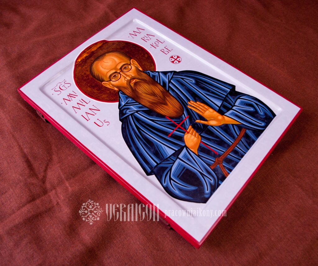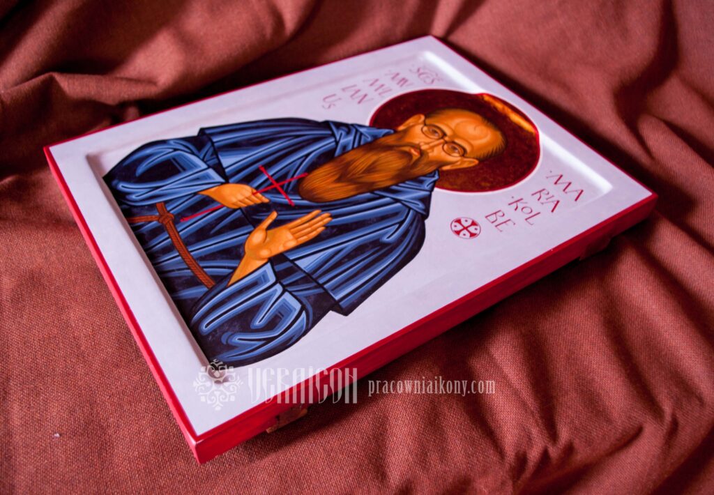 This original icon of Saint Maximilian Kolbe depicts the saint in the Franciscan habit, holding a cross in his hands – a symbol of his faithfulness to Christ and his readiness for sacrifice. The figure is shown with calm focus and simplicity, emphasizing his monastic spirituality and a life devoted to prayer and service.