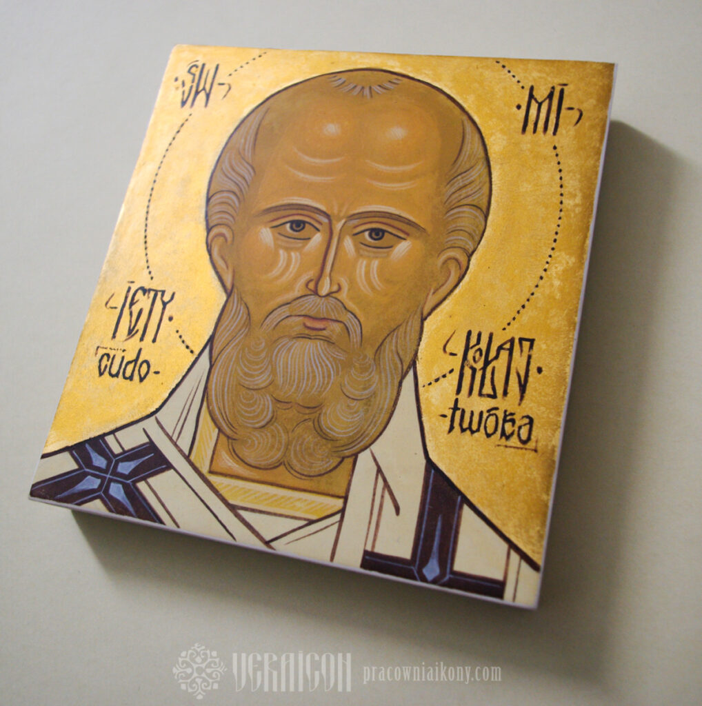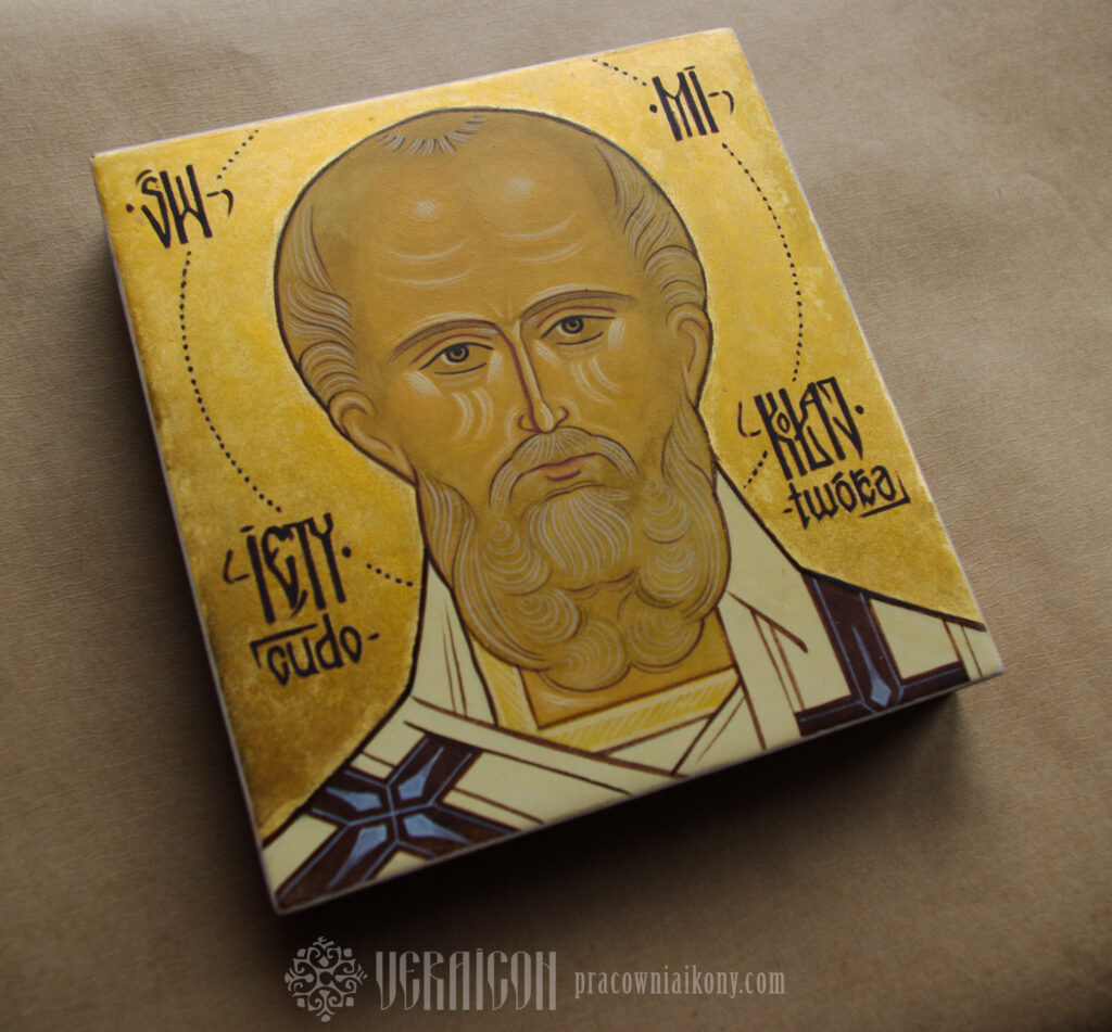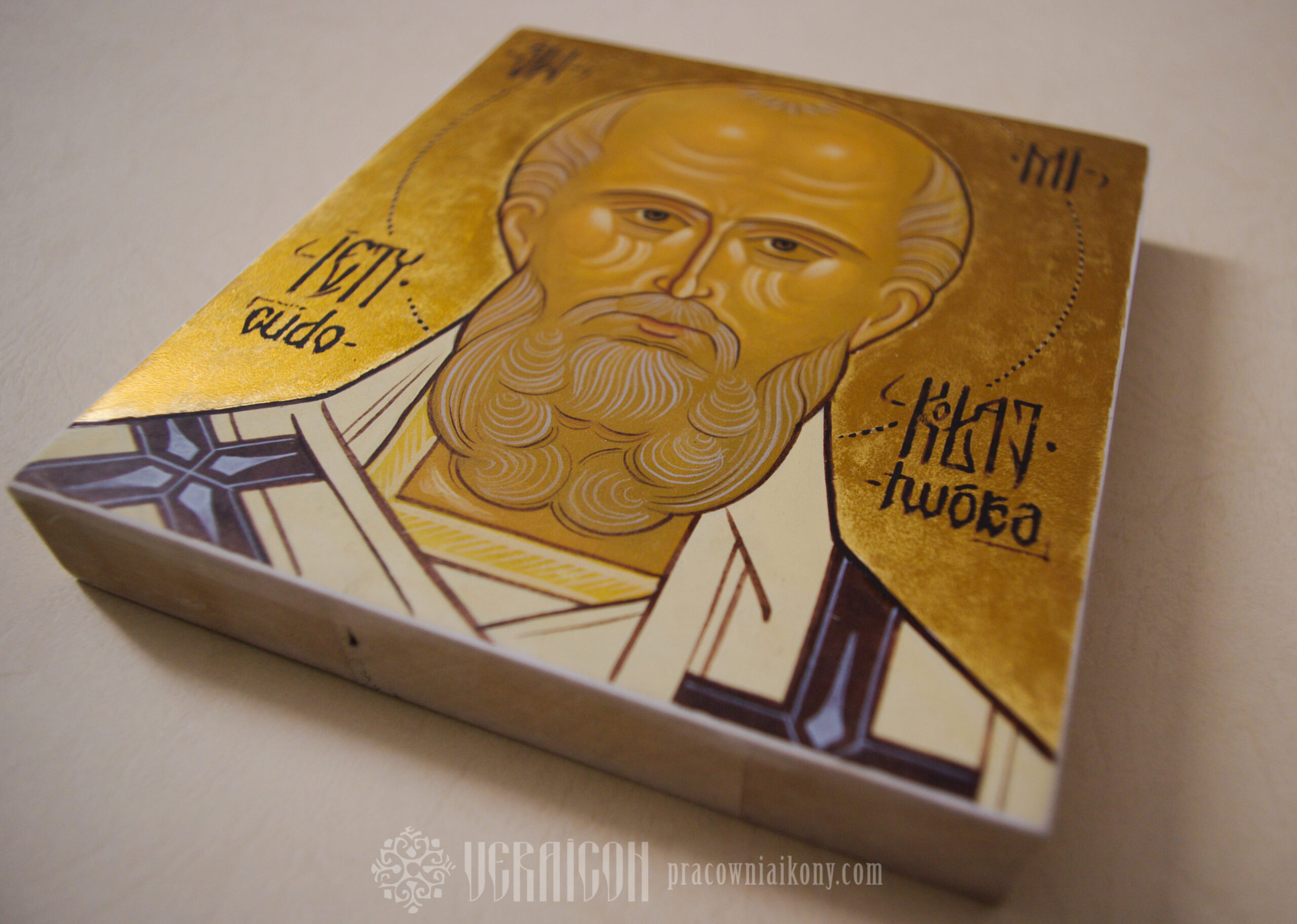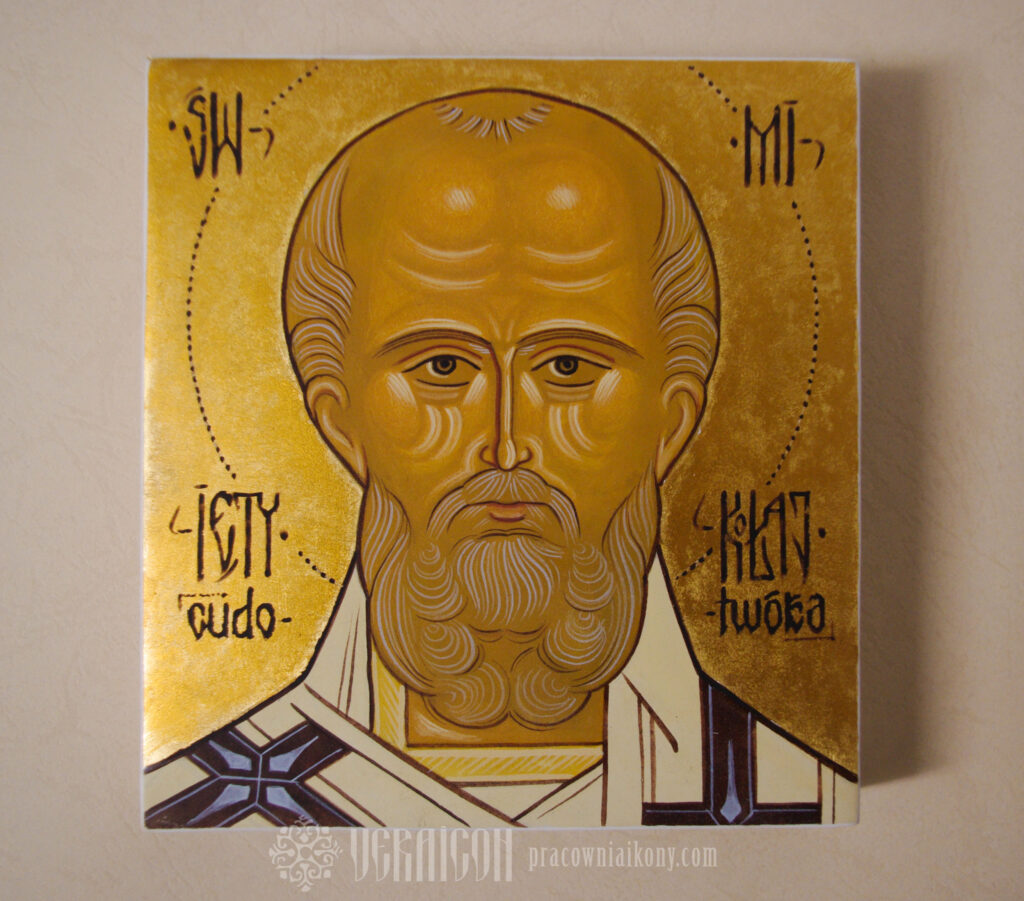 Podpis po obu stronach postaci (Άγιος Νικόλαος) znaczy po grecku „Święty Mikołaj”. Charakterystyczna biała szata ozdobiona motywem ornamentalnym z czarnych krzyży równoramiennych to ornat biskupi z czasów Cesarstwa Bizantyńskiego. Na niego nałożony jest omoforion- szeroki pas z krzyżami zarzucony na szyję. Był on oznaką godności biskupiej i symbolizował historię o zabłąkanej owcy, którą Chrystus wziął na ramiona i zaniósł do domu Ojca. Święty trzyma w lewej ręce zamkniętą księgę. Tak przedstawia się postaci Ojców Kościoła, autorów tekstów religijnych, Ewangelistów i świętych nauczających. Dłoń nakryta szatą świadczy o szacunku; w dworskiej etykiecie Bizancjum, cennych przedmiotów, szczególnie w obecności cesarza, nie można było dotykać odkrytymi dłońmi.