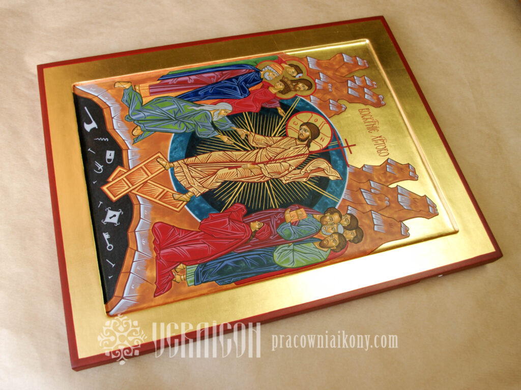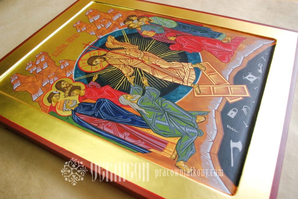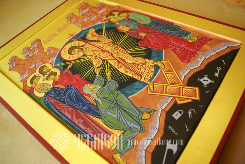 Jest to kompozycja wielofigurowa; w jej centrum znajduje się postać Chrystusa otoczonego ciemnobłękitną sferą – symbolem Królestwa Niebieskiego lub Wszechświata. Otchłań (piekło) przedstawiona jest jako czarna pieczara, w której widzimy symbole niewoli i tortur – kłódki, klucze, gwoździe, łańcuchy, topór. Złamane wrota pod stopami Chrystusa to bramy piekielne, znak zwycięstwa nad śmiercią. Zbawiciel ubrany jest w złote szaty, które oznaczają Jego przebóstwione ciało. Pochyla się On i chwyta za rękę Adama, wyciągając go jako pierwszego z Otchłani. Po drugiej stronie klęczy pierwsza Matka – Ewa, za nią postaci symbolizujące wszystkich starotestamentowych sprawiedliwych i proroków czekających na zbawienie.
