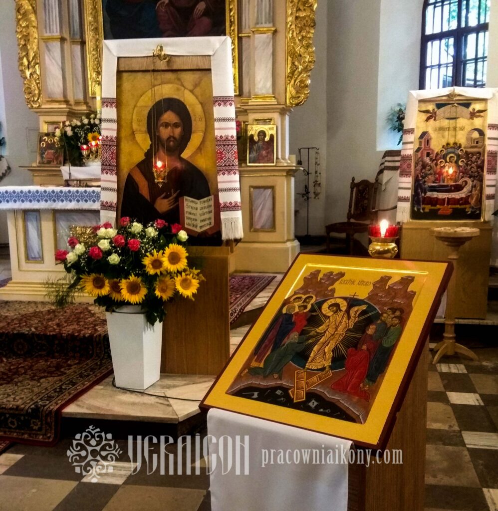 Technika: tempera żółtkowa, złoto płatkowe na desce lipowej. Rozmiar: 42 x 54,5 cm. 2022 r.