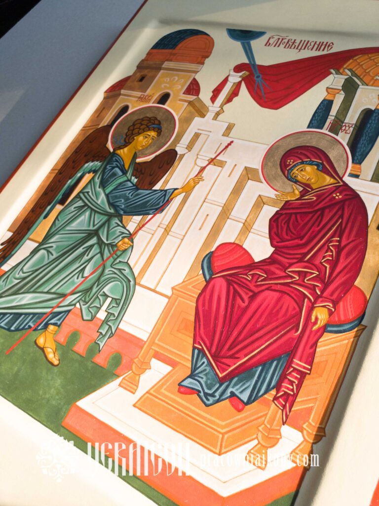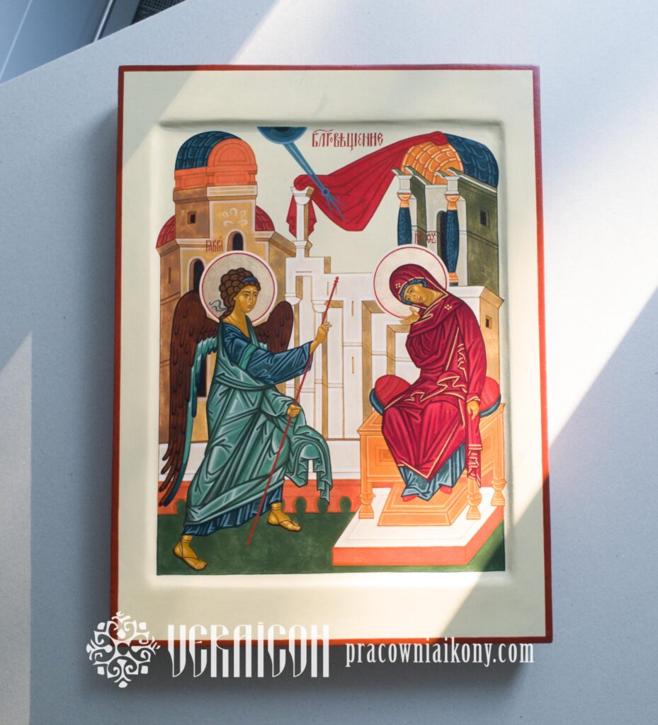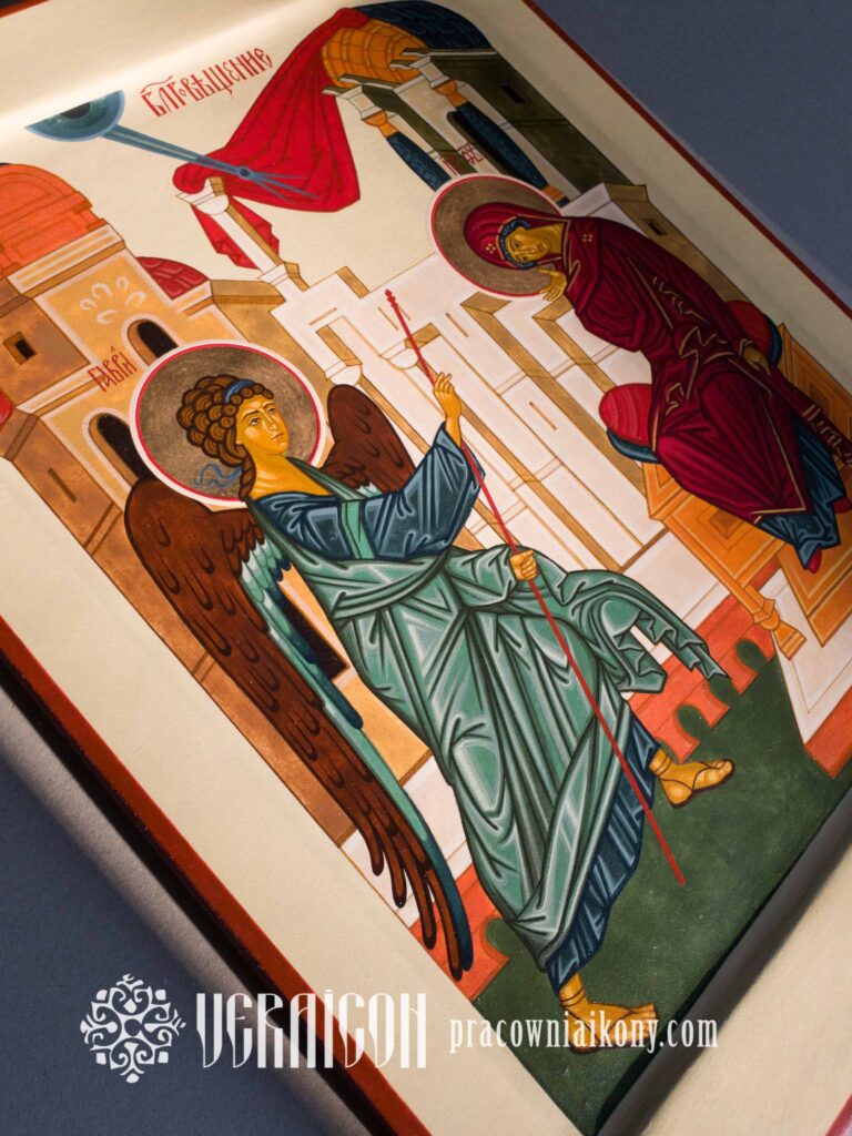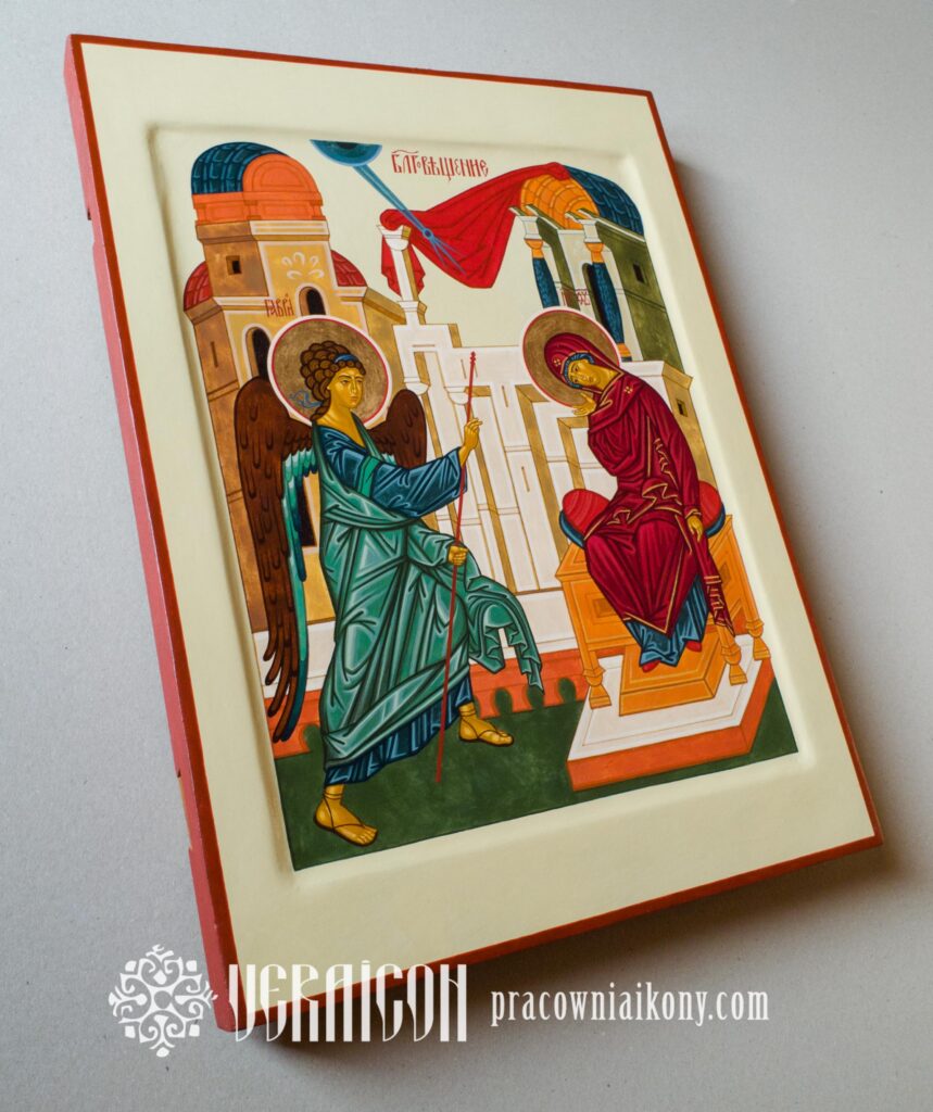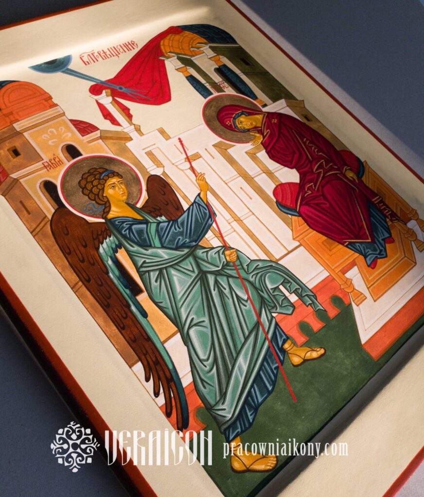 Pomniejszona kopia ikony Zwiastowanie autorstwa Andrieja Rublowa zachowuje klasyczny układ spotkania Archanioła Gabriela z Maryją oraz wierne odwzorowanie detali. Została jednak opracowana w nieco zmienionej, bardziej współczesnej stylistyce, głównie dzięki zastosowaniu lekkiego tła w odcieniu chłodnej szałwi zamiast klasycznego złota. Takie połączenie barw nadaje kompozycji świeżość i przestrzeń, podkreślając ciszę oraz duchowe napięcie chwili Zwiastowania.