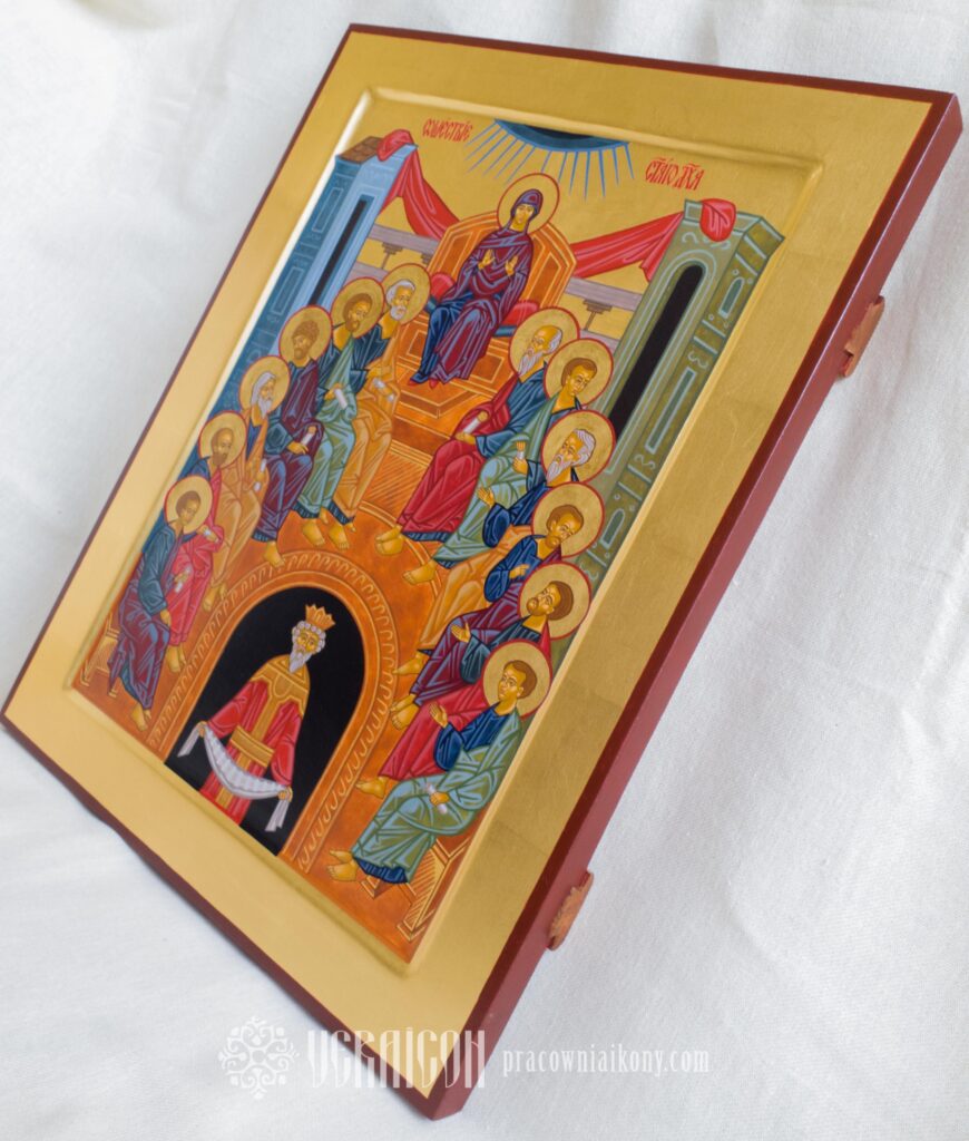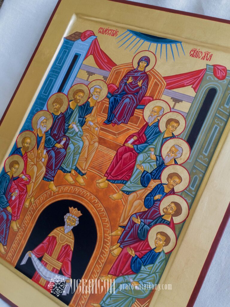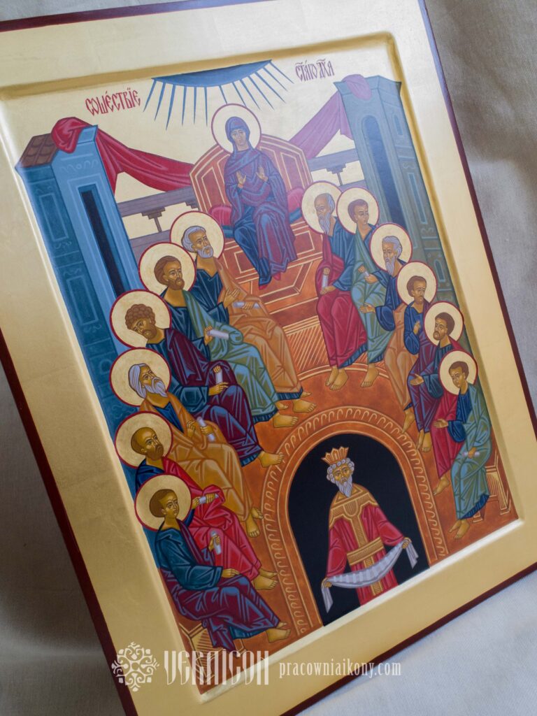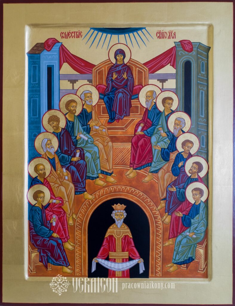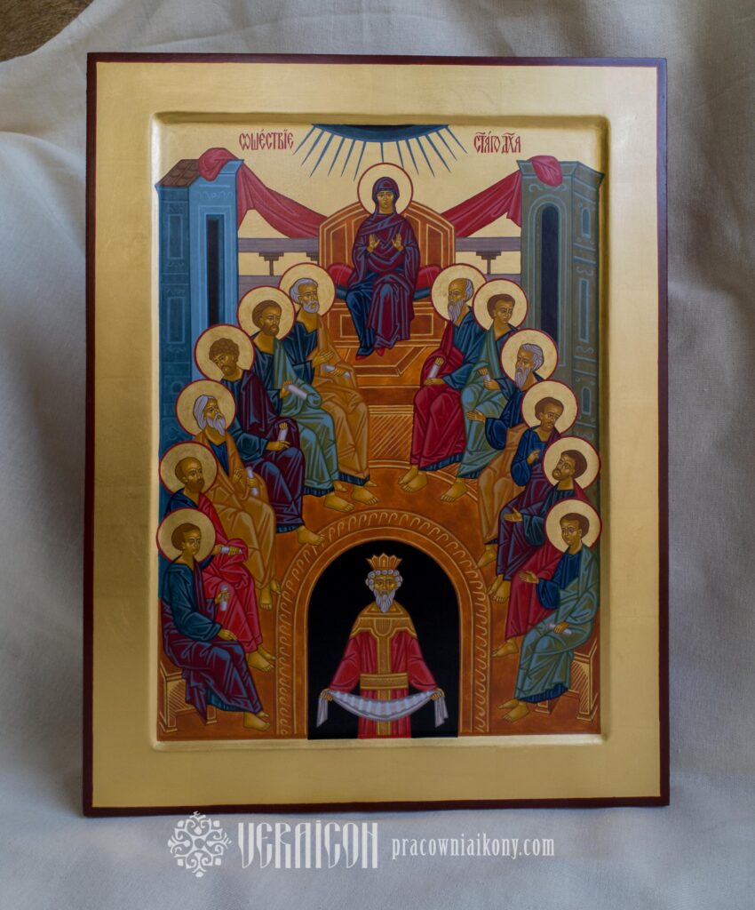 Klasyczna ikona Zesłania Ducha Świętego przedstawia apostołów zgromadzonych w półkolu, w przestrzeni symbolicznego wnętrza, które oznacza Wieczernik.