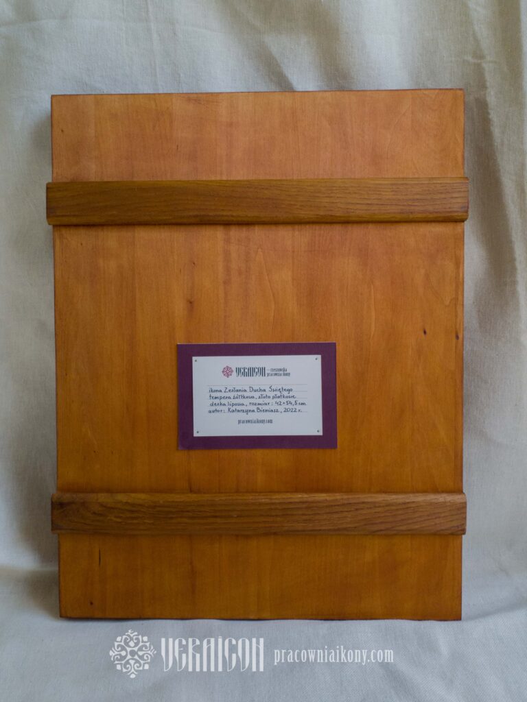 Tempera żółtkowa, złoto płatkowe na desce lipowej. Rozmiar: 30×40 cm.